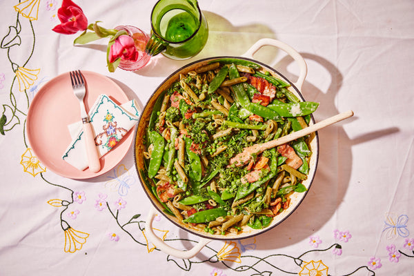 Kook de peultjes, erwten en asperges 2 min kort in kokend gezouten water, verfris onder koud water en laat uitlekken. Kook ook de pasta zoals vermeld op de verpakking, giet af en houd het kookvocht bij.