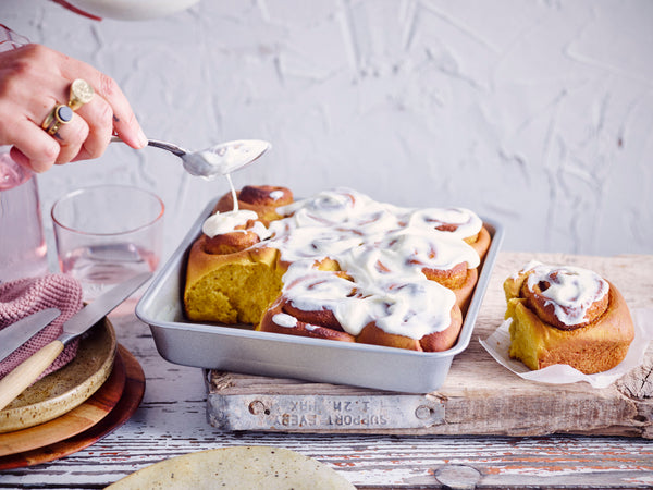 Klop alle ingrediënten voor de romige icing onder elkaar en smeer het op de lauwe rolls…