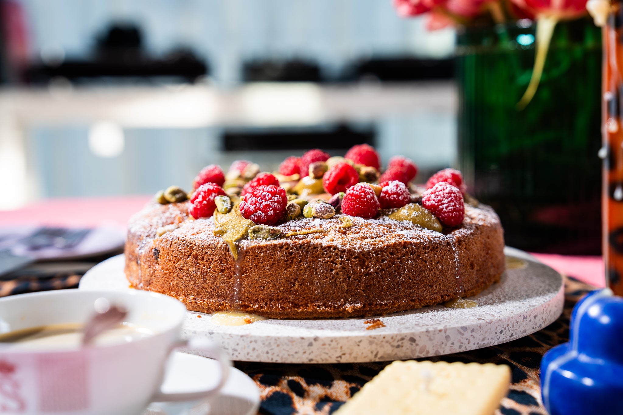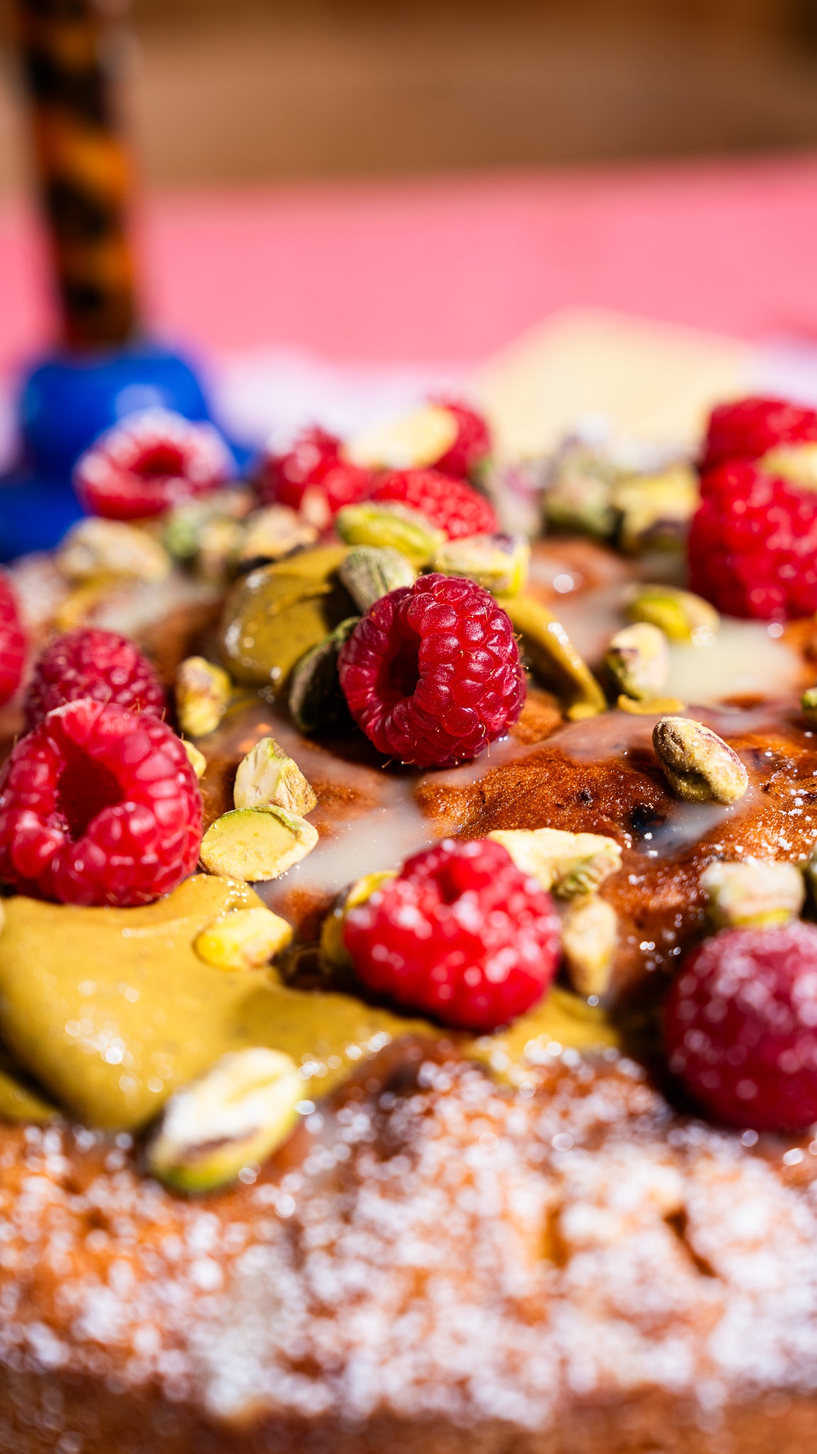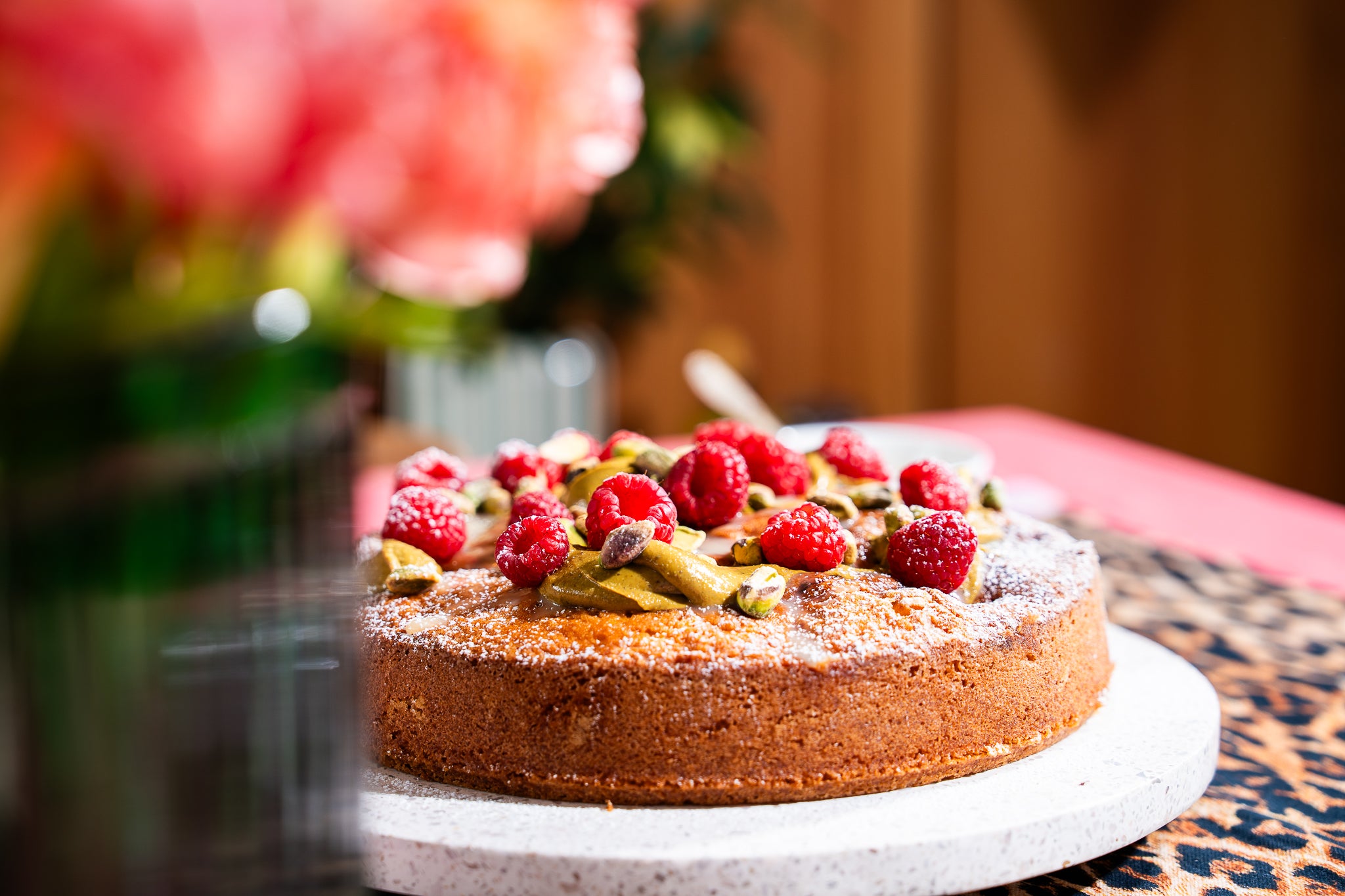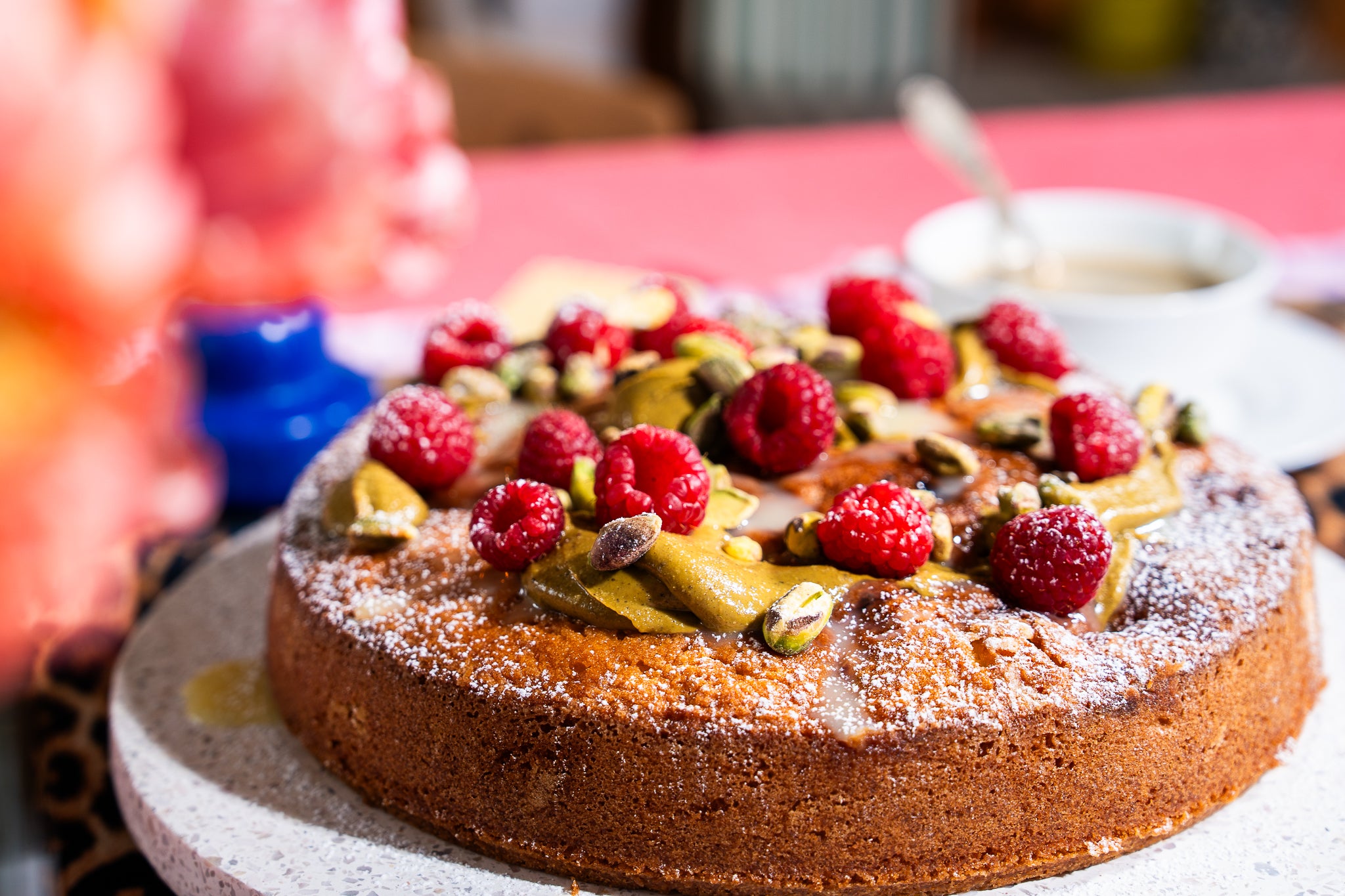 Quatre-quart cake met frambozen, pistache & witte chocoladeganache