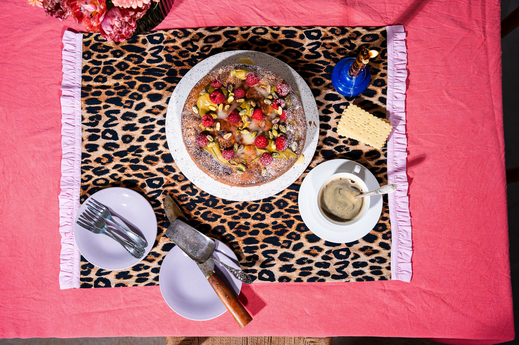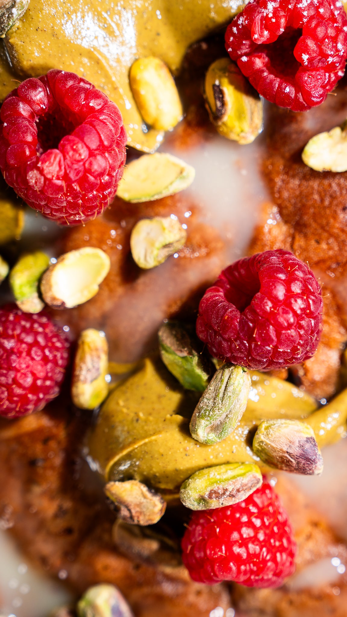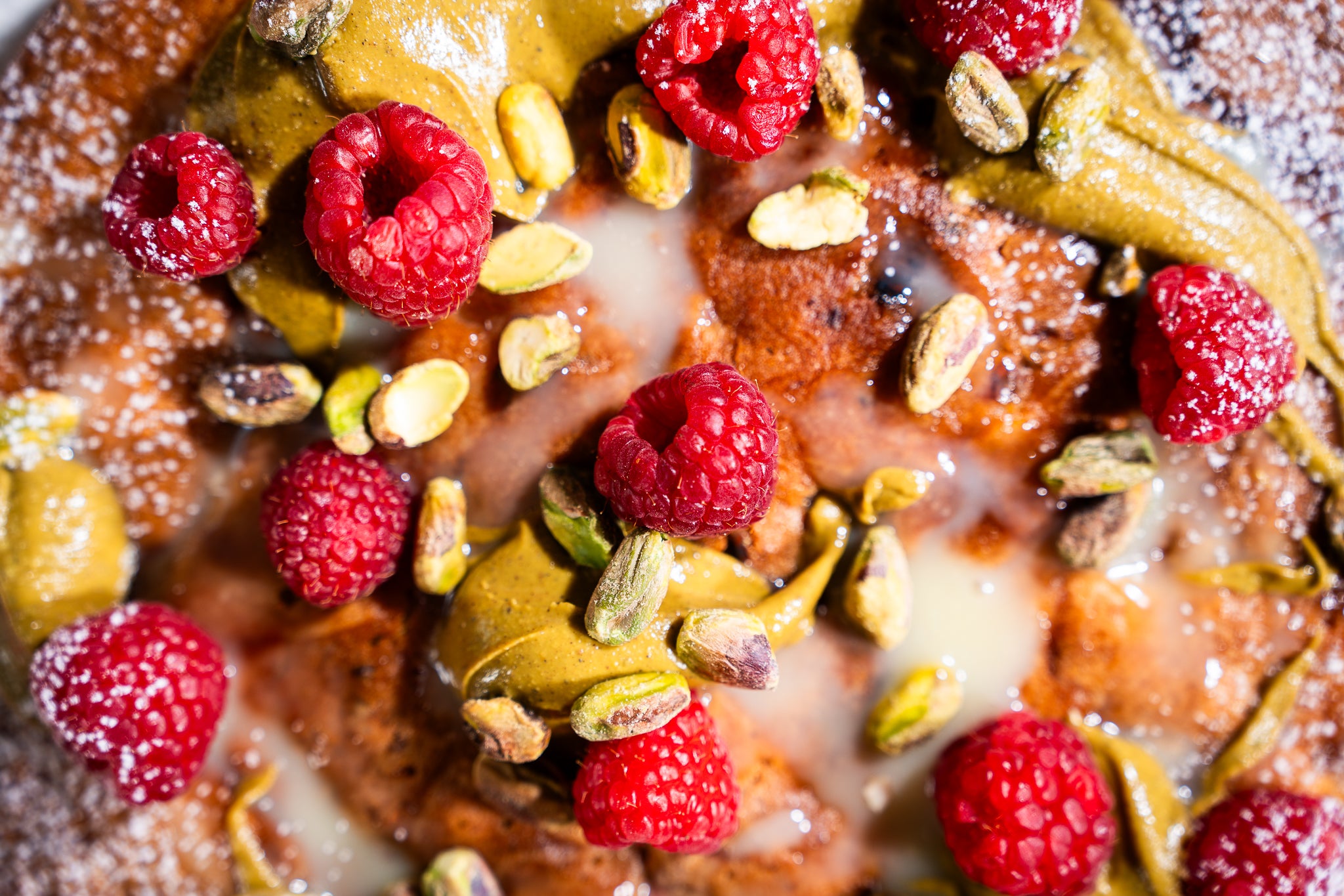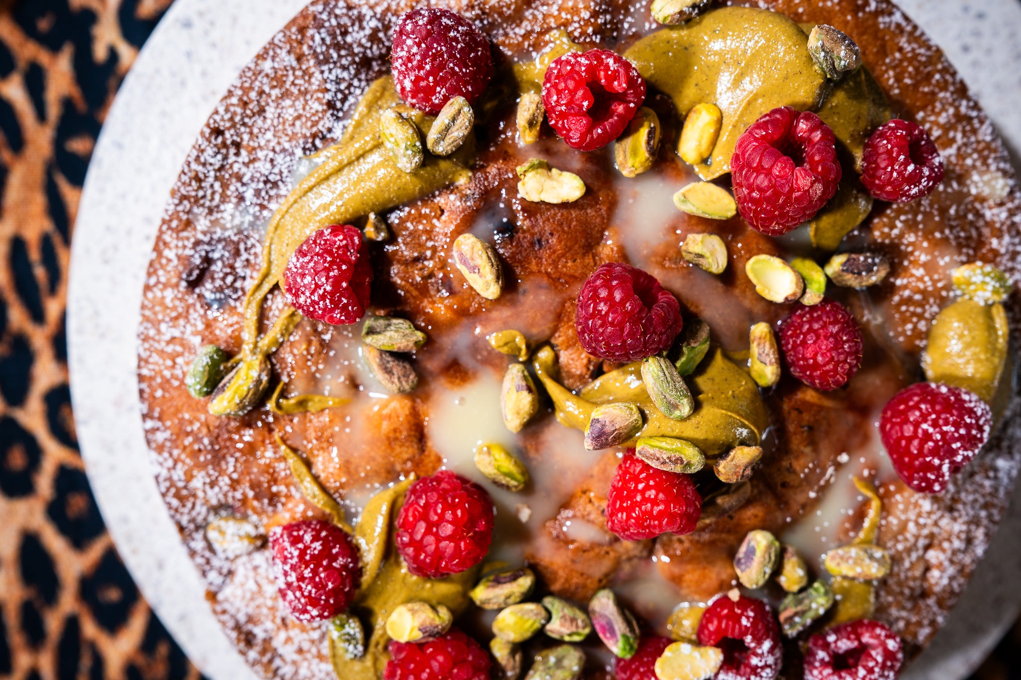 Quatre-quart cake met frambozen, pistache & witte chocoladeganache