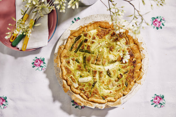 Verdeel de asperges en de pens over de bodem, giet eiermengsel erin en bak 30 min.