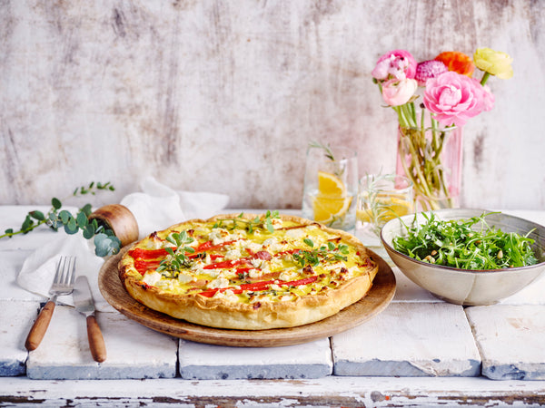 Verdeel iets meer dan de helft paprika en gebakken spek op de bodem van het gebakken deeg, giet er het eier-yoghurt mengsel erop, leg er de rest van de paprika’s en spek op en nog wat oregano blaadjes.