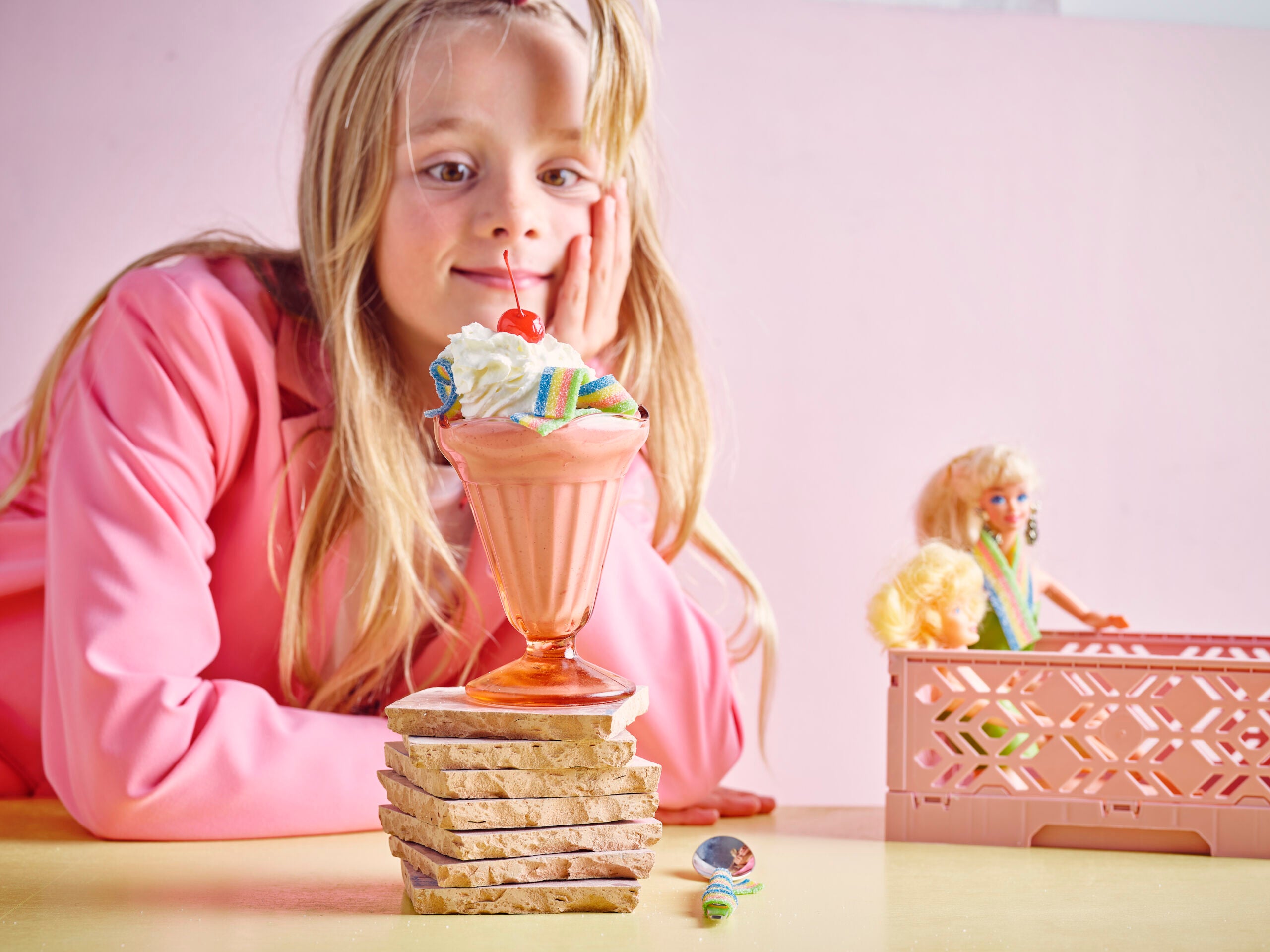 Een mooie rainbow milkshake met rood fruit, een wolkje slagroom, blinkende kers en regenboog matten, ik zie er al een paar wegdromen.