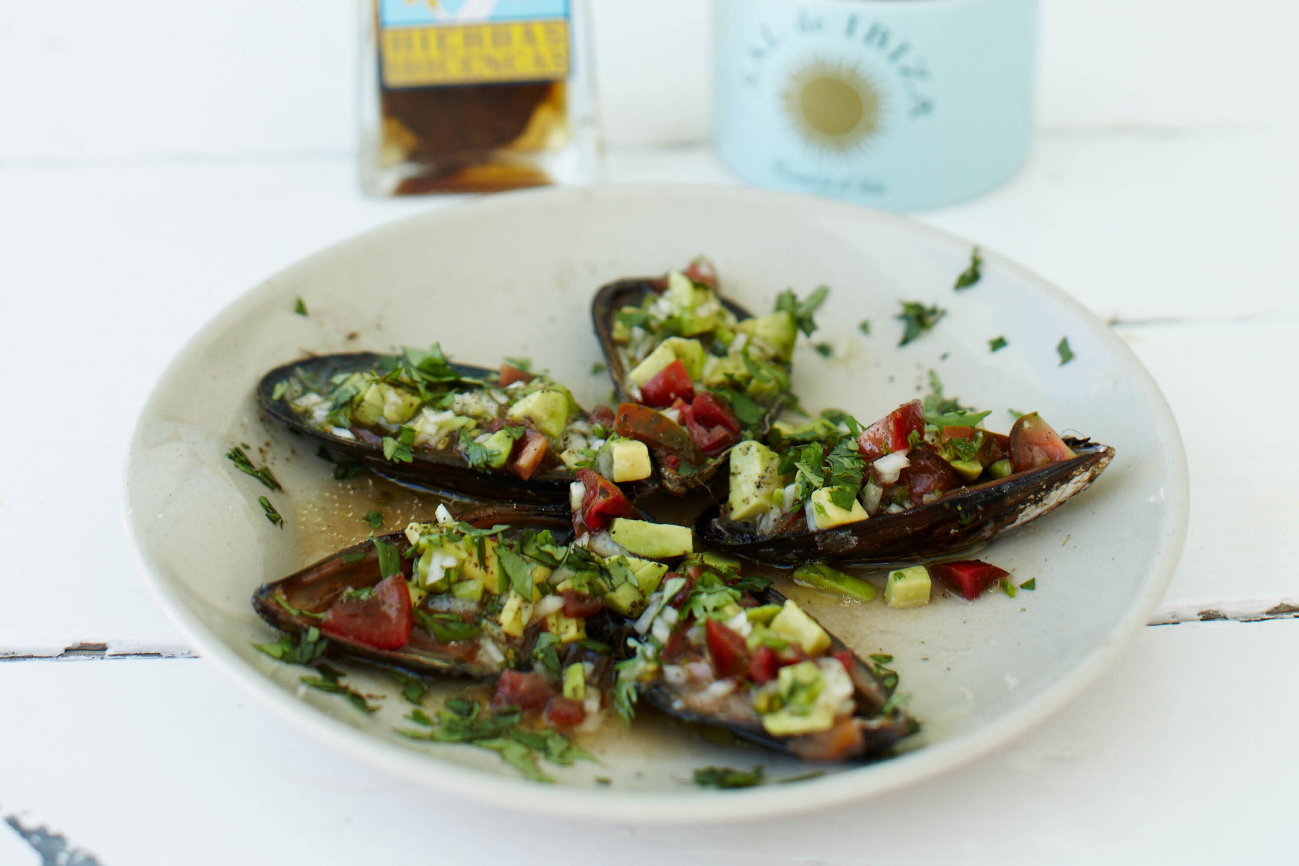 Een verrassend aperitief met rauwe mosselen op smaak gebracht met Hierbas de Ibiza, avocado en tomaten. Perfect voor een zomerse avond!