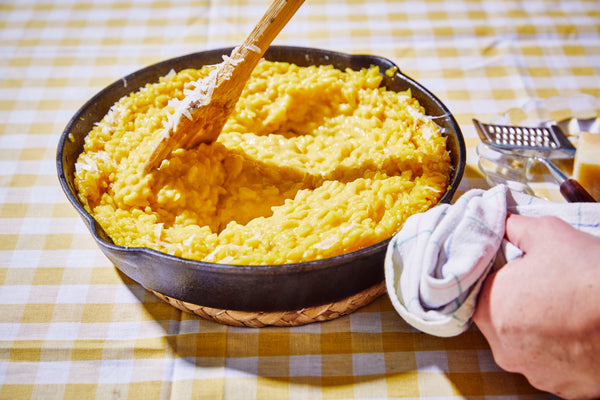 Voor risotto gebruik je best carnaroli, arborio of ronde rijst. Met de restjes van de risotto kan je een heerlijk aperitiefhapje maken: arancini!
