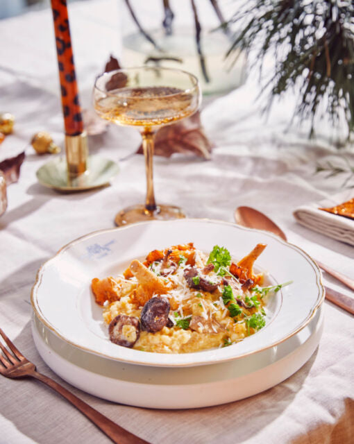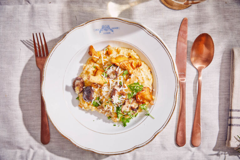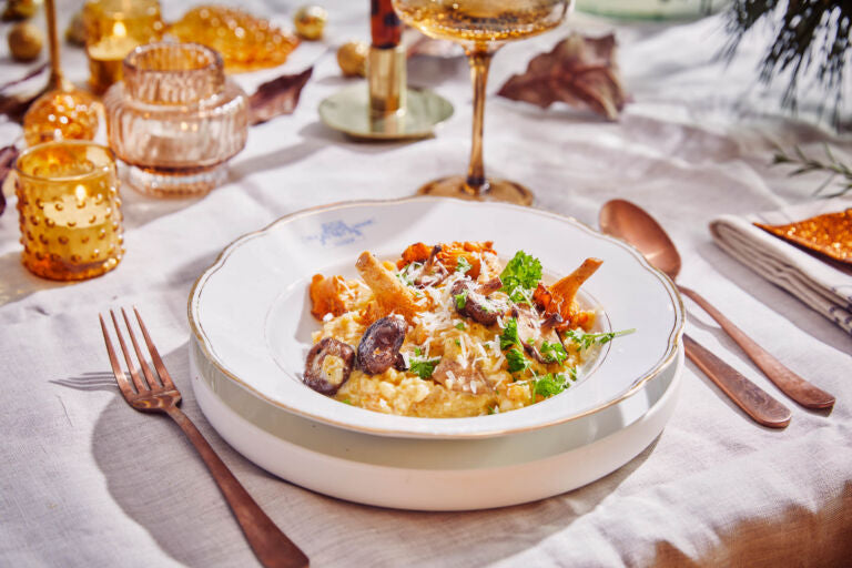 Risotto met pompoen, chili, mascarpone, look, pecorino, bospaddenstoelen en citroen