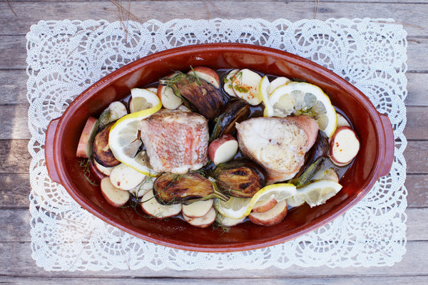 Een ovenrecept van rode poon met aubergine, aardappel en citroen. Gemakkelijk om te bereiden en ideaal met een glas witte wijn!