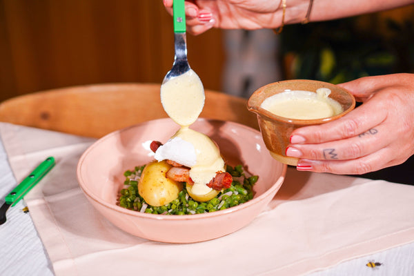 Alle basiselementen blijven behouden – aardappelen, boontjes, spek en ei – maar dan met nét dat tikkeltje meer verfijning: gestoomde Princesse Amandine-aardappelen, krokant spek, een zachte picklescrème en een tartaar van boontjes met sjalot. Perfect als lichte lunch of als voorgerecht bij een feestelijk menu.