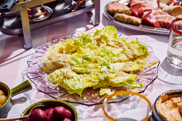Salade met vinaigrette, Parmezaan en ansjovis. Heerlijke sidedish voor bij de raclette, gourmet of barbecue. Ontdek het recept!