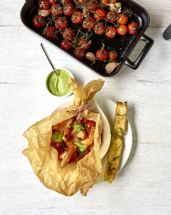 Open elke papillot aan 1 kant. Serveer de scampi’s zo, afgewerkt met kleine tomaatjes en pesto. Serveer er de focaccia bij.