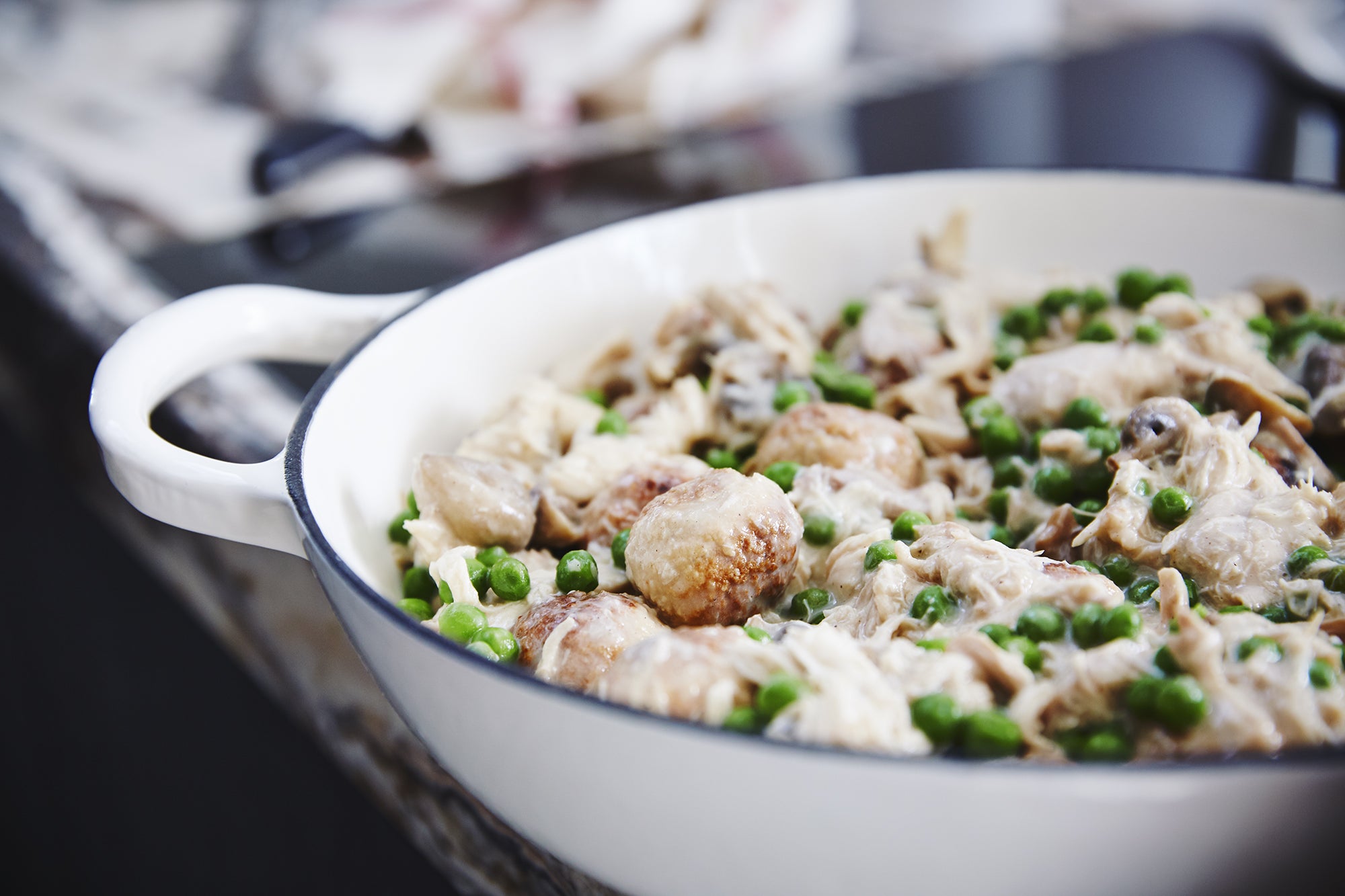 • Voeg het kippenvlees, gehaktballetjes, paddenstoelen, erwten en room toe.