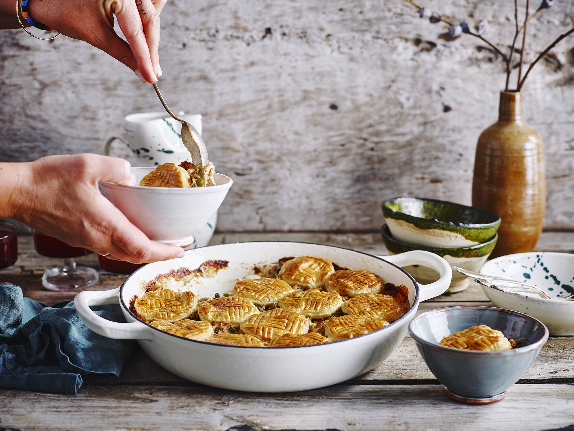 Een vol au vent maar dan met bladerdeeg korst erop ! Een megaschotel om midden op tafel te zetten.
