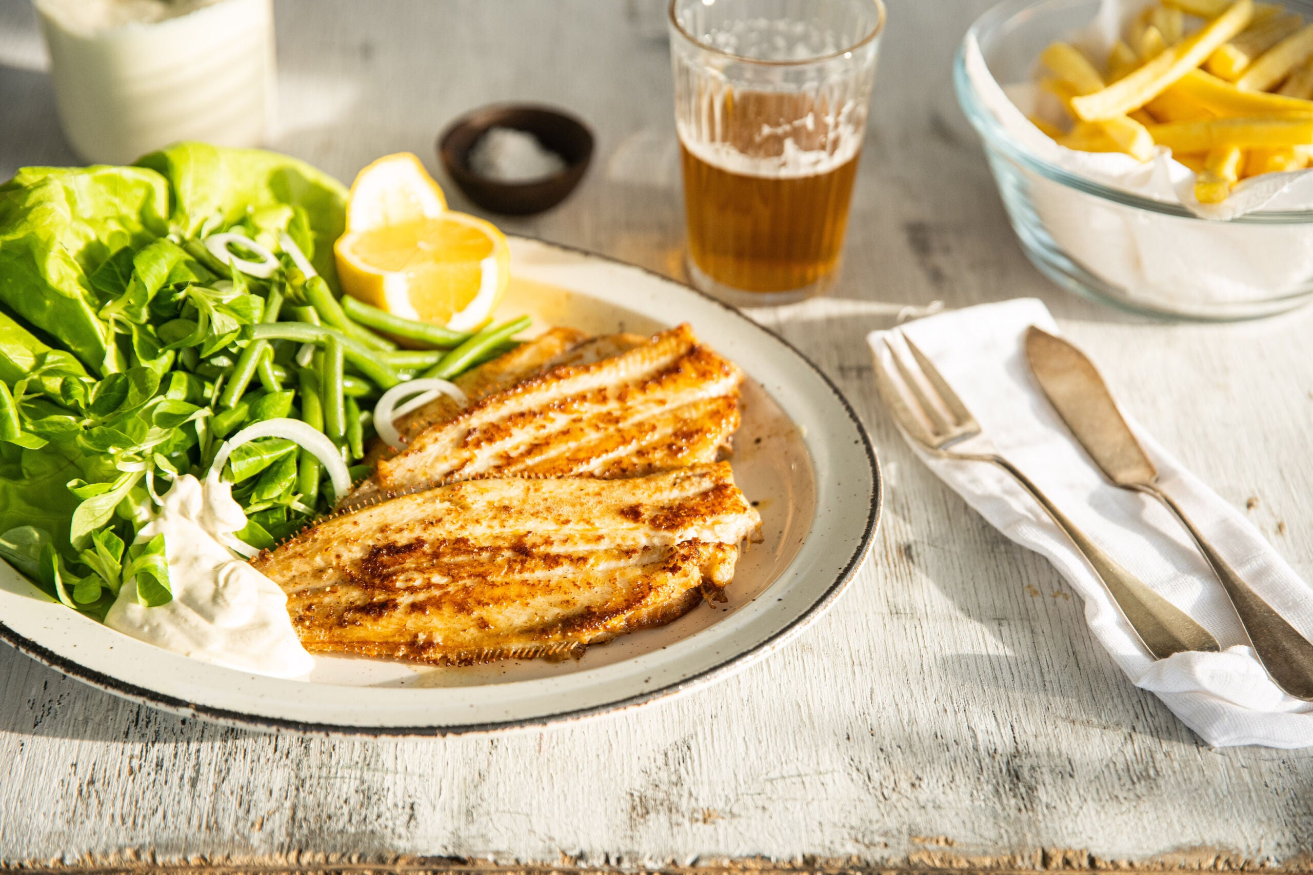 Bak de frietjes af, leg ze op keukenpapier en zet ze aan tafel.