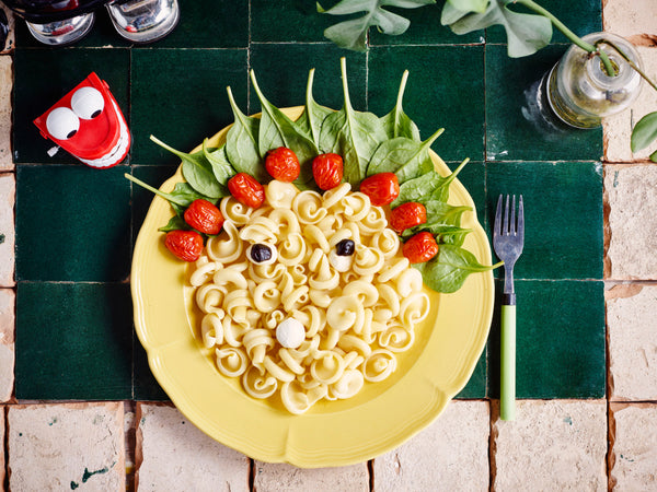 Dresseer elk je eigen bord, een ronde vorm als gezicht vol pasta, haar van spinazie, kroontje van tomaten. Ogen, mond en neus met de mozzarrellaballetjes en olijven. Smiley faces werken altijd beter.