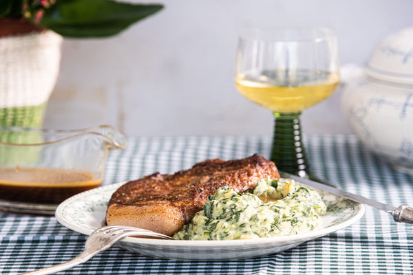 Stamp de spinazie samen met de rest van de boter in de aardappelen, kruid en voeg room toe.