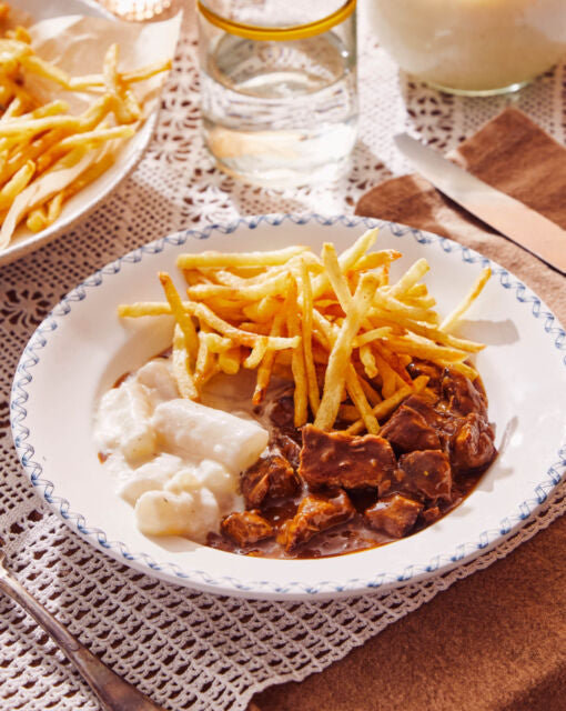 Stoofvlees in bruin bier met peperkoek en mosterd, verse frietjes en schorseneren in bechamelsaus
