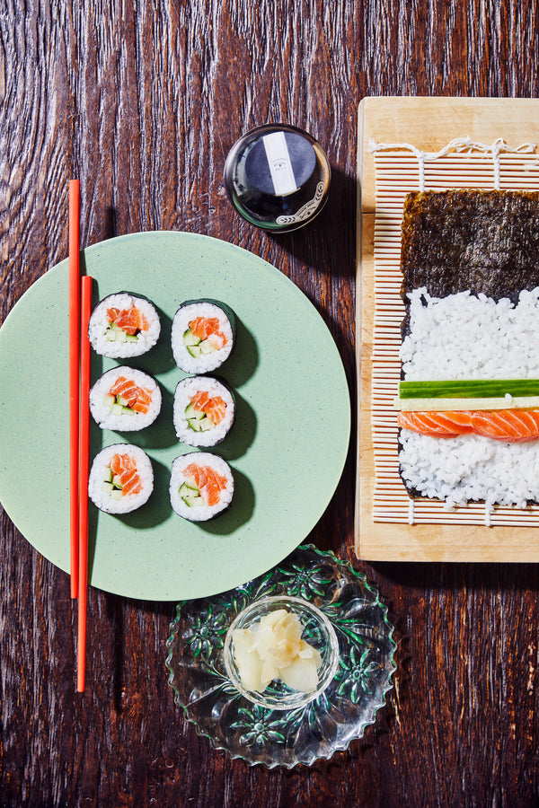 Leg in midden van de rijsstrook, egaal van links naar rechts de zalm en de komkommer.