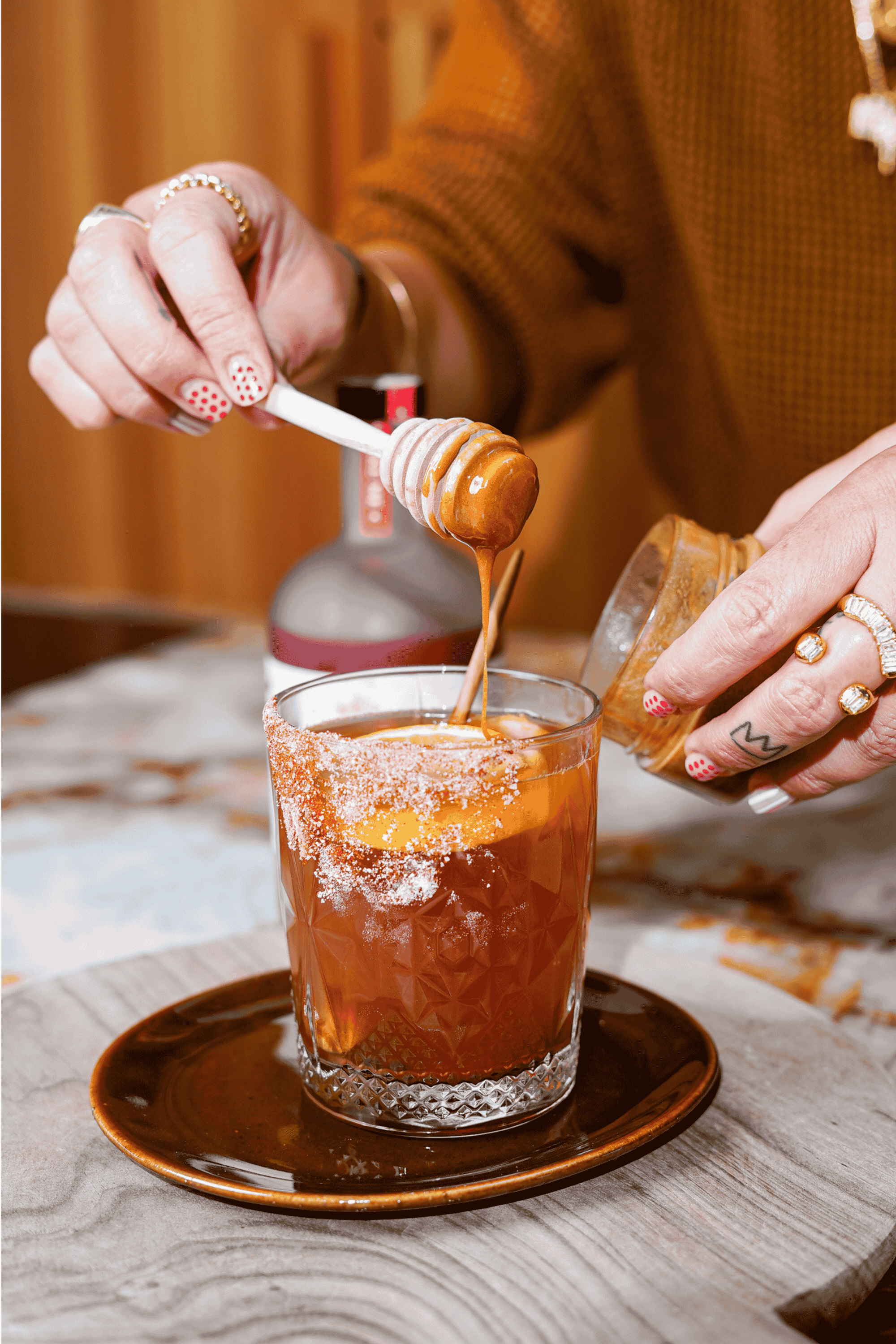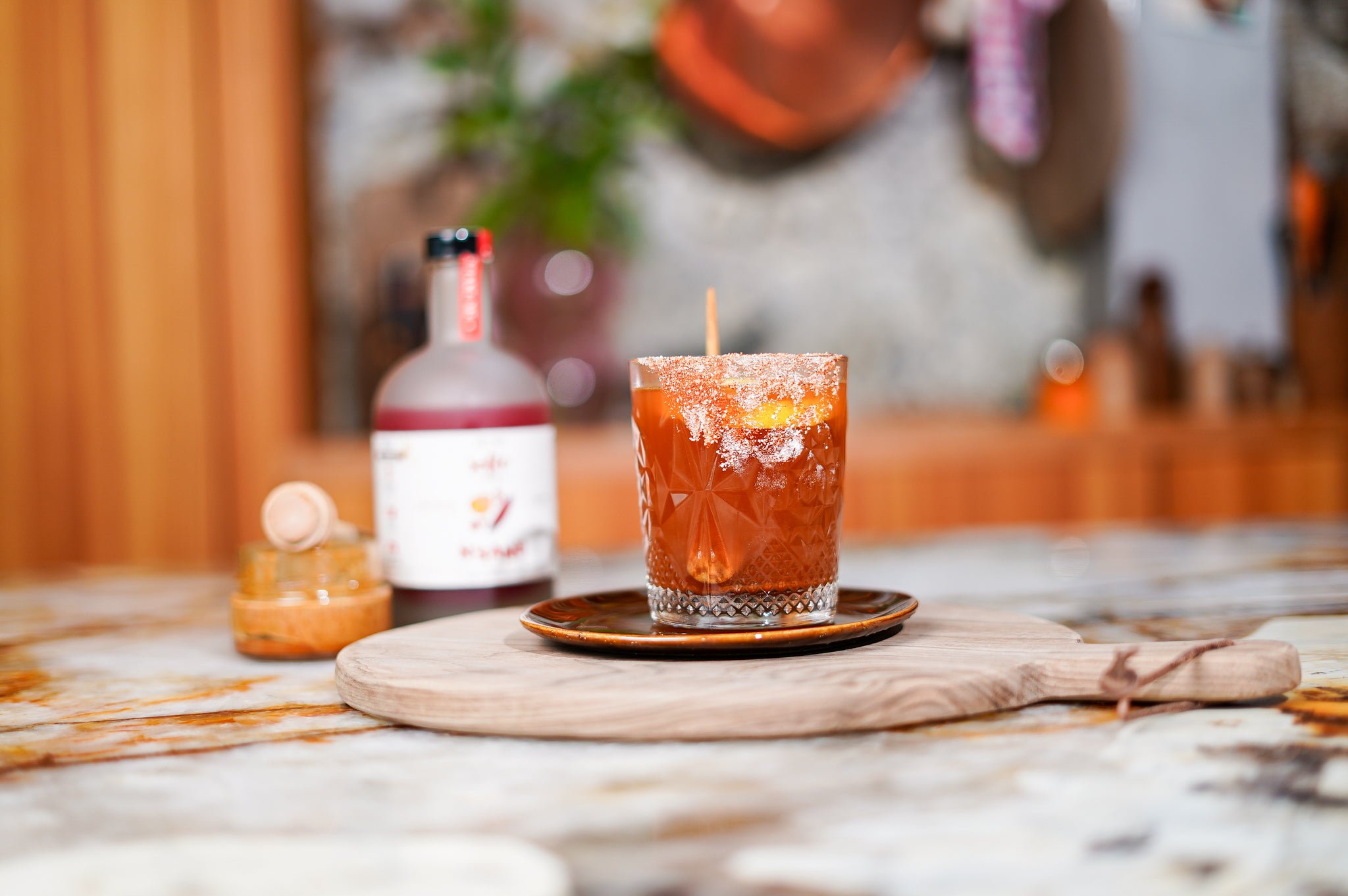 Snijd de appelsien doormidden en wrijf de rand van je mok of glas ermee in. Dip de rand vervolgens in chipotlezout voor een smoky touch.of mengeling suiker/chipotle poeder