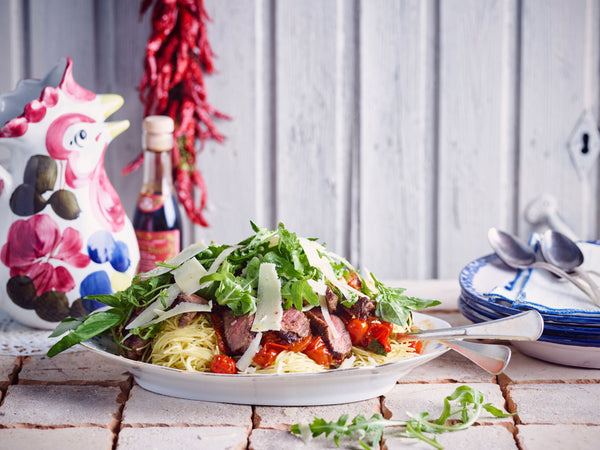 Rasp er Parmezaanse kaas over en werk af met basilicum, rucola, olijfolie en balsamico.