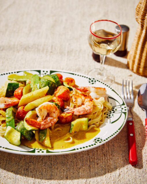 Serveren: Giet de tagliatelle af en verdeel over diepe borden. Schep de groenten en scampi’s erover en giet de saus eroverheen.