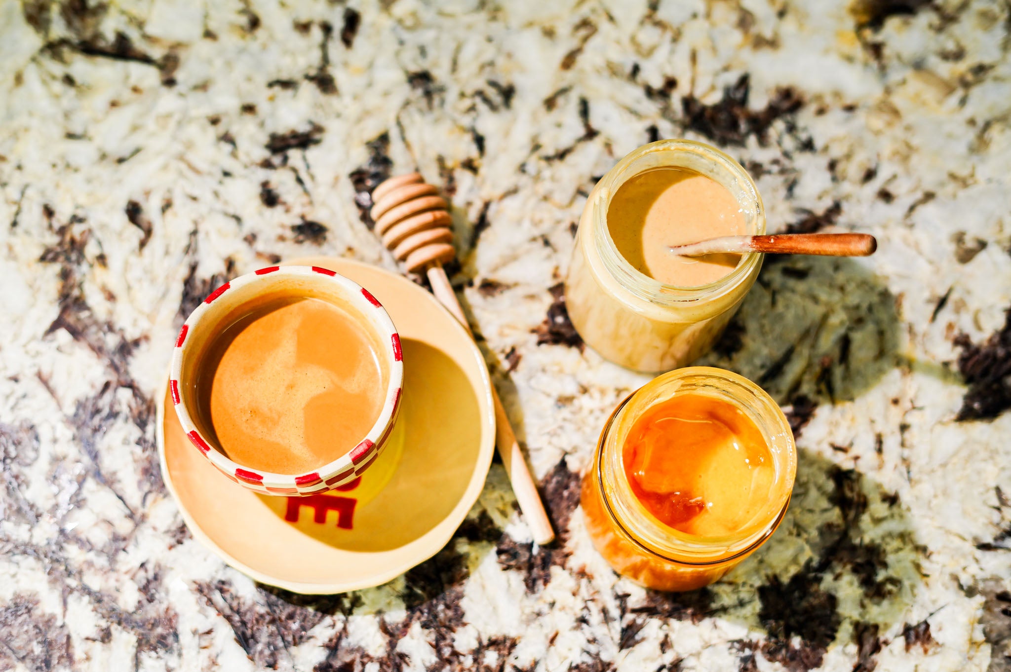 Doe de tahin in een koffiekopje. Voeg er eventueel honing aan toe.