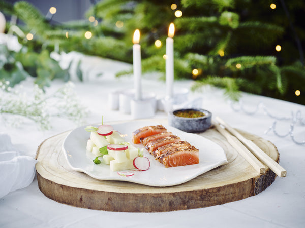 Leg de filets op de borden, schik er de daikon en fijngesneden schijfjes radijs bij, serveer de saus ernaast in kommetjes.