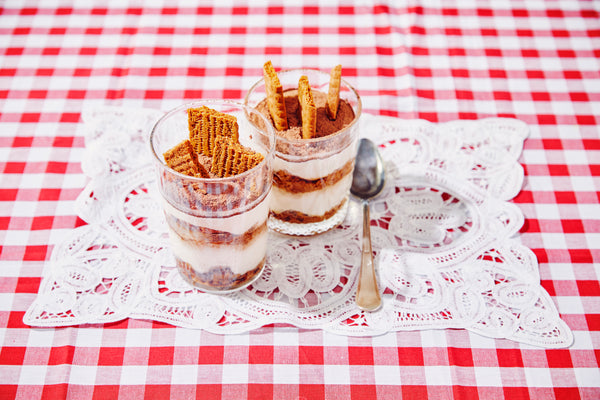 Om af te werken zeef je er een goede laag cacaopoeder op en werk af met koekjes in de helft gebroken, serveer!