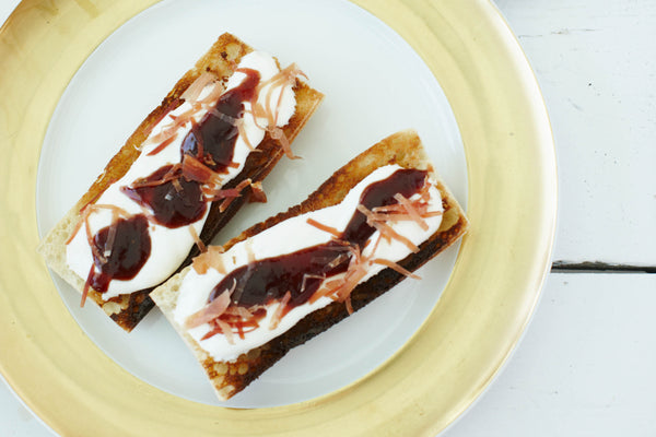 Toast met Plattekaas, Aardbeienconfituur en Serranoham