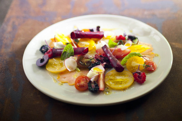 Snijd de verschillende soorten tomaten in diverse vormen en dresseer ze mooi op de borden.