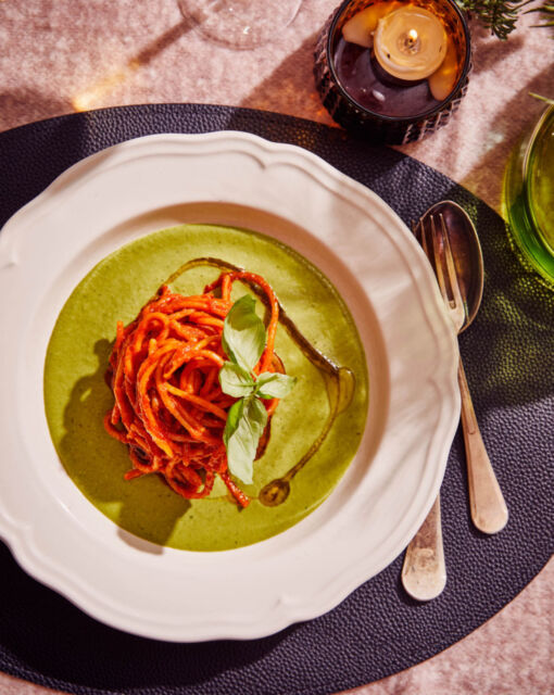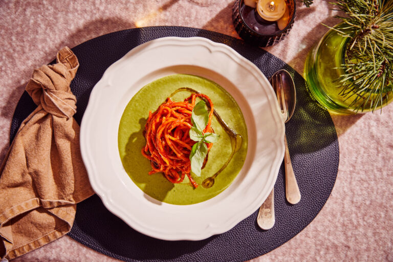Serveren: Plaats een flinke lepel van de artisjokcrème in het midden van een diep bord.