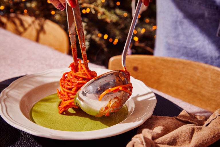 Draai de pasta op met een vleesvork en vorm een mooi nestje op de crème.