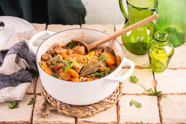 Laat alles samen nog een 20-tal min verder sudderen. Haal deksel eraf moest je saus nog niet gebonden zijn. Werk af met platte peterselie.