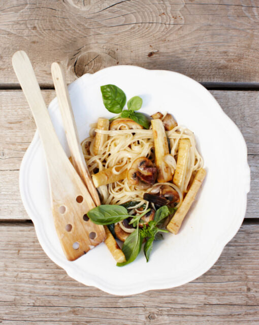 Groenten voorbereiden: Snijd de champignons in dunne plakjes. Snijd de pastinaak in acht dunne parten. Schillen is niet nodig, goed wassen volstaat.