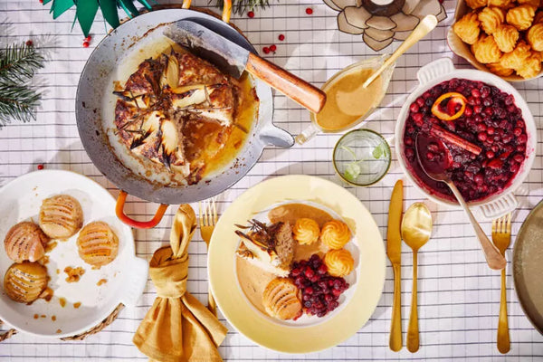 Snijd plakken van het vleesbrood, bak de kroketjes, verwarm de veenbessen en appels, serveer op mooie borden. Zet de rest op tafel.