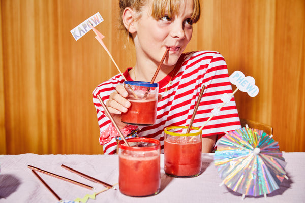 Vul 4 glazen met ijsblokjes en giet de juice erop. Steek er rietjes in voor een feestelijke toets. Serveer direct.