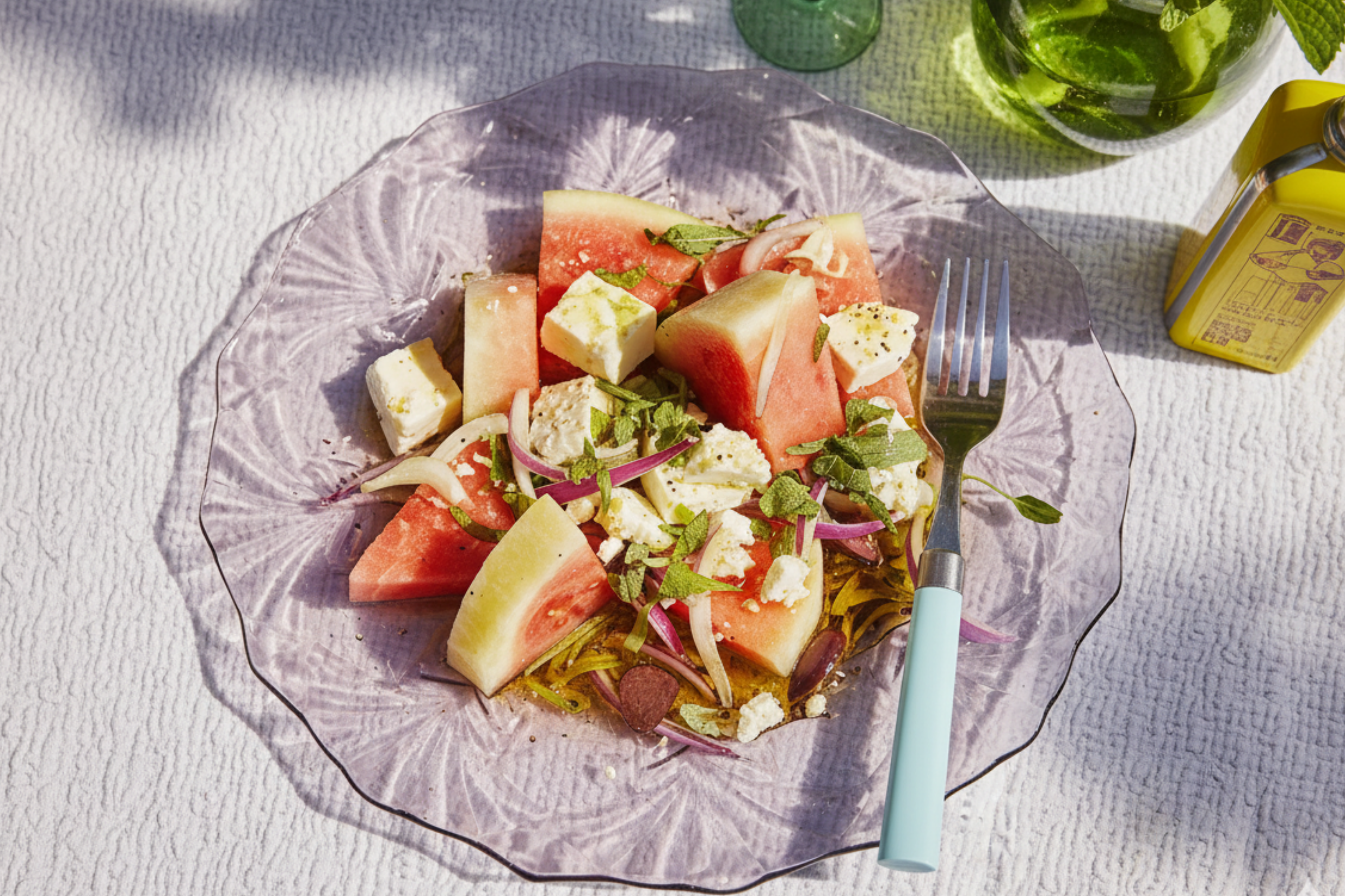 Serveer de salade meteen zodat de watermeloen fris blijft en de feta en olijven hun textuur behouden.