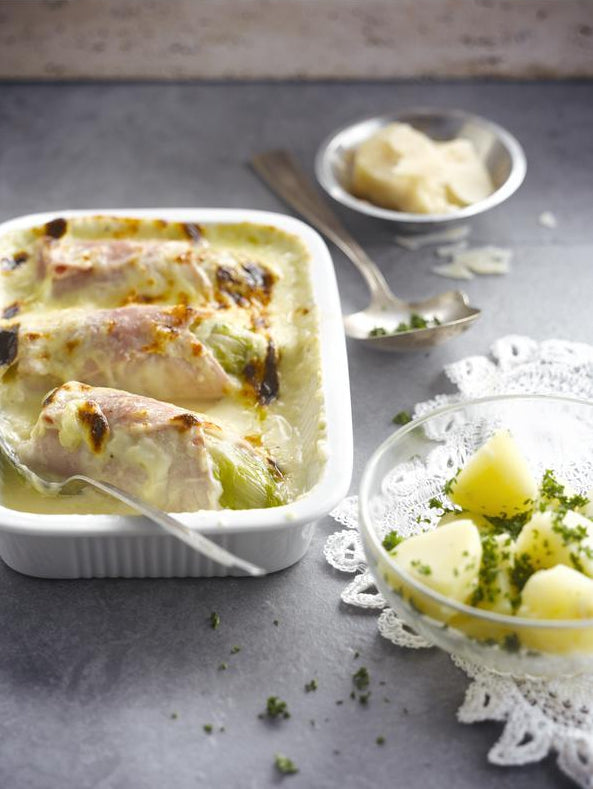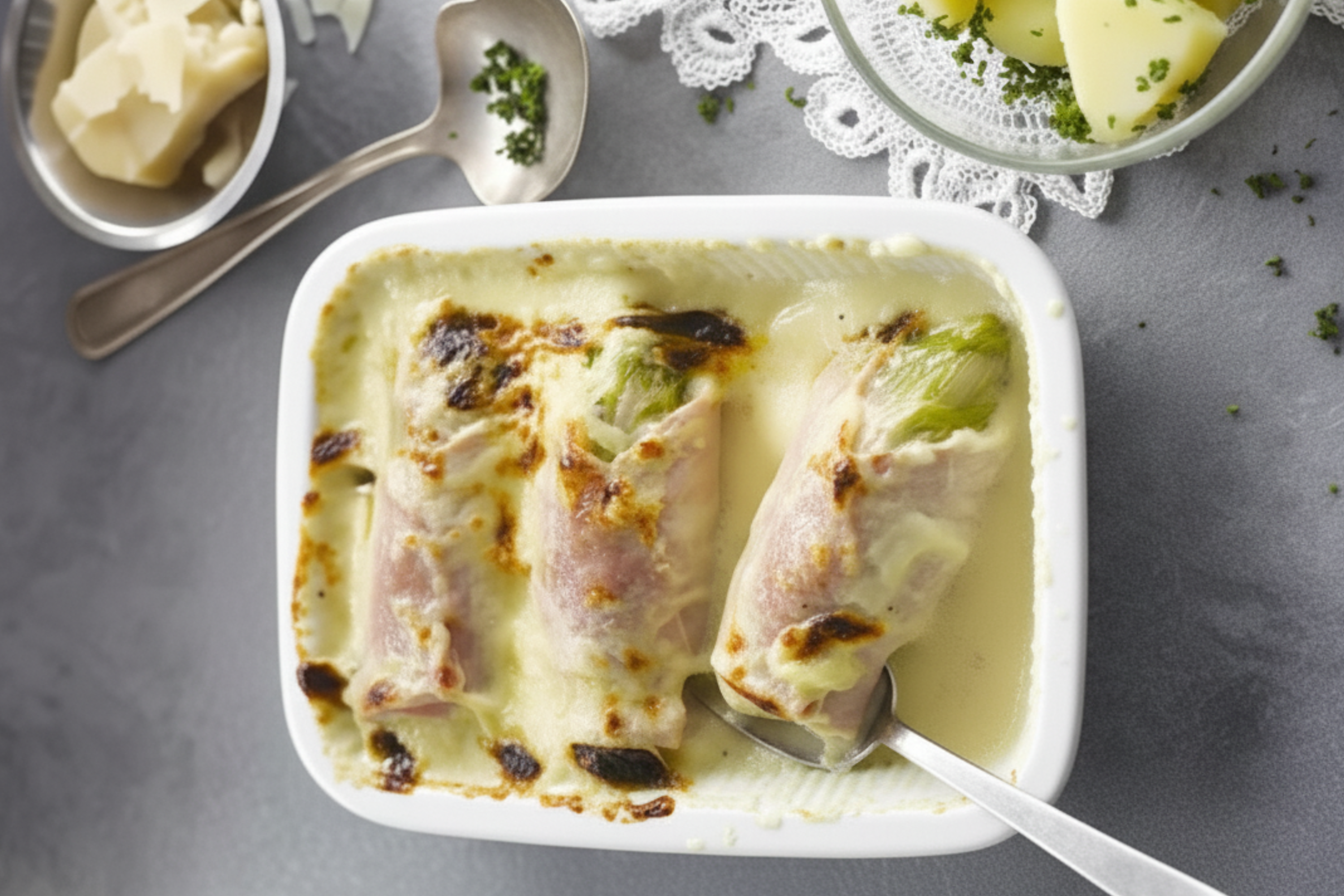 Rol elke witloofstronk in een sneetje ham en leg de rolletjes netjes in een ovenschaal. Giet de kaassaus over de rolletjes zodat ze net onderstaan. Strooi eventueel extra kaas over de bovenkant.
