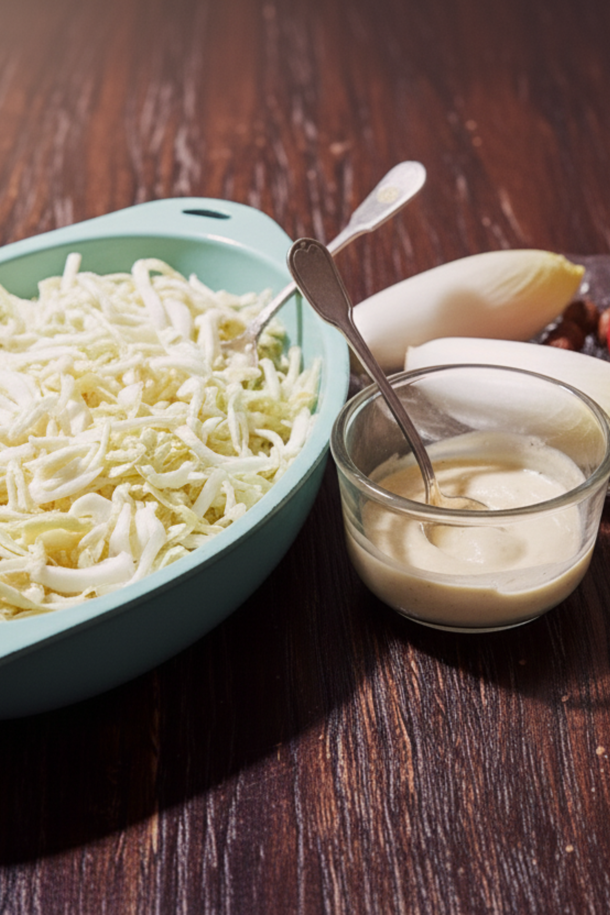 - Wil je de salade al klaarzetten? Snijd het witloof en spoel het, laat goed uitlekken. Meng de mayonaise en andere ingrediënten pas op het laatste moment erbij voor een frisse en knapperige salade.