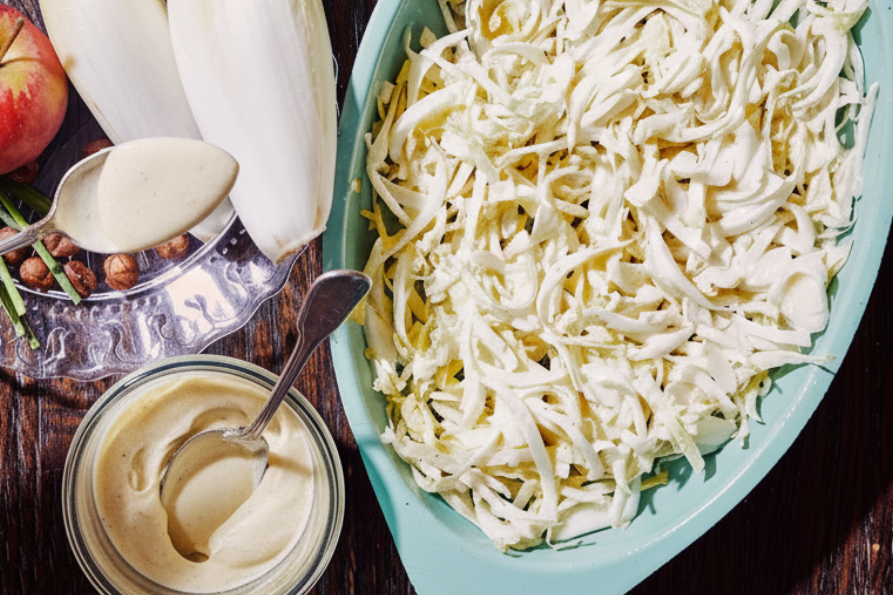 - Laat de mayonaise op kamertemperatuur komen vóór je hem mengt met het witloof, zo vermijd je dat de saus te stijf is en behoud je een luchtige structuur.
