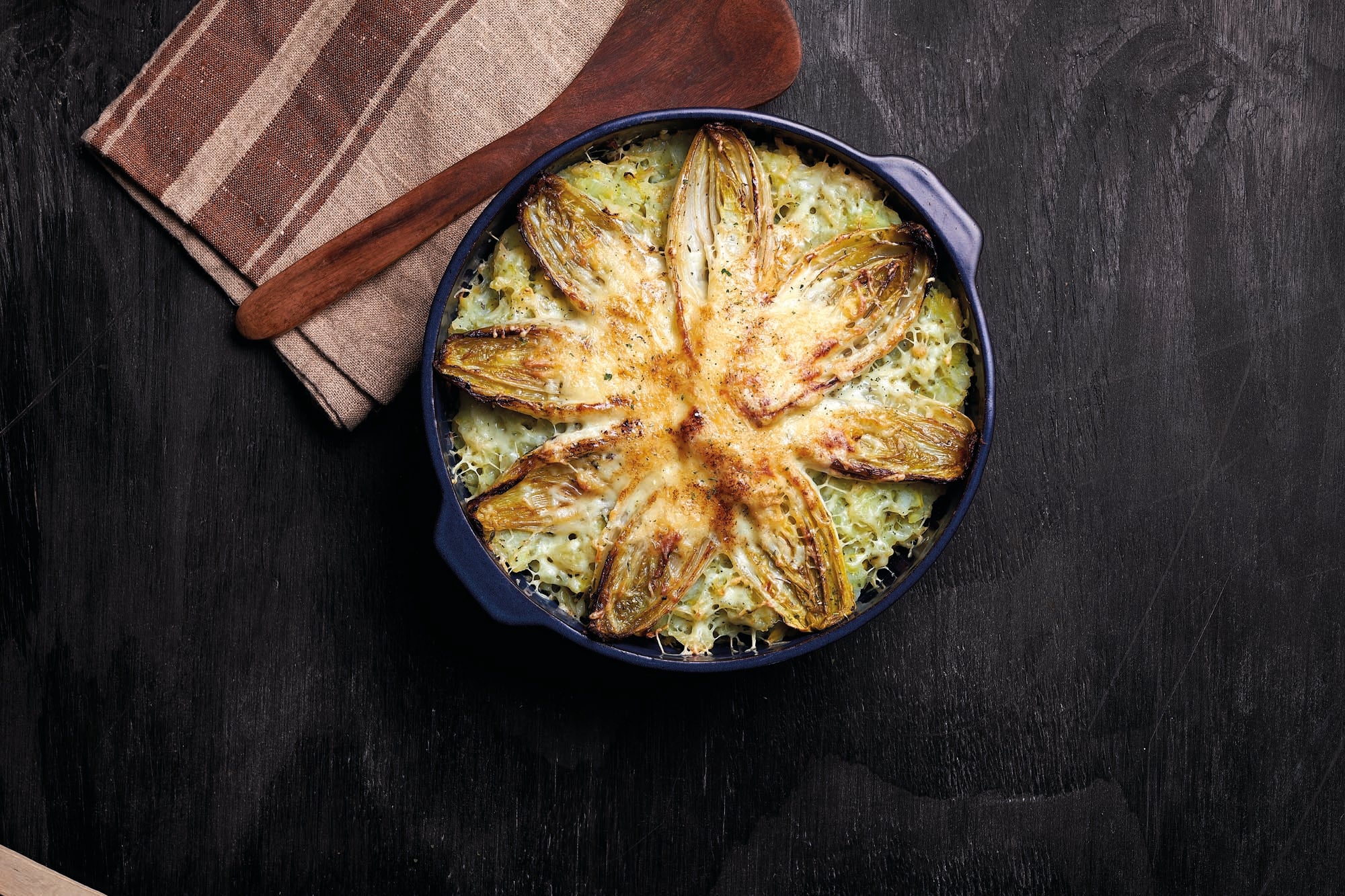 Witloof voorbereiden: Snijd het kontje van het witloof en halveer de stronken in de lengte. Verhit 1 el olijfolie in een vuurvaste ovenschotel. Leg het witloof met de snijkant naar beneden en laat karamelliseren. Draai om en laat ook de andere kant licht kleuren. Haal het witloof uit de pan en zet apart.