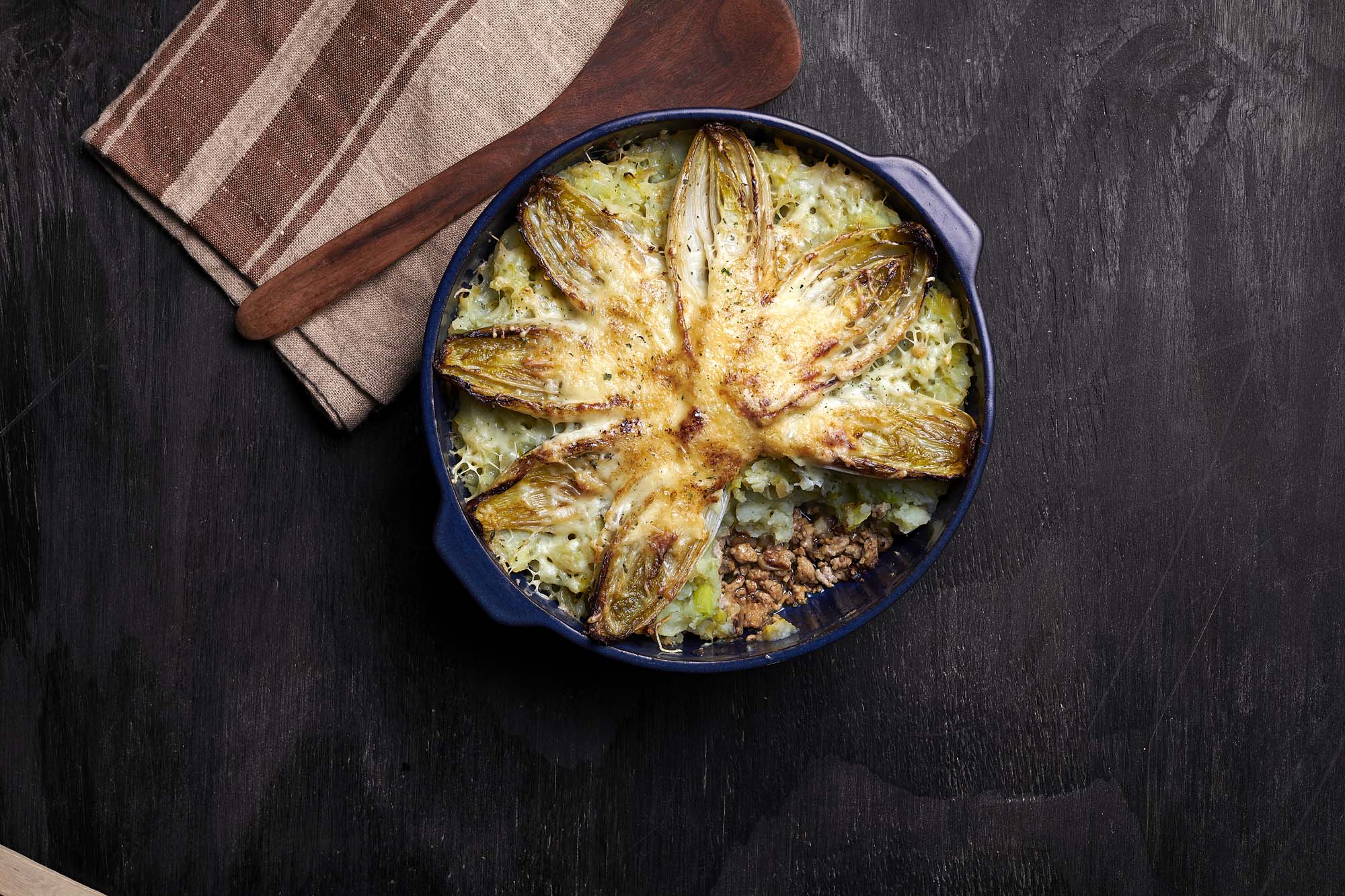 Opbouwen van de witloofschotel: Strijk de preipuree uit bovenop het gehakt. Leg de gekaramelliseerde witloofstronkjes erop met de snijkant naar boven. Bestrooi rijkelijk met geraspte emmentaler.