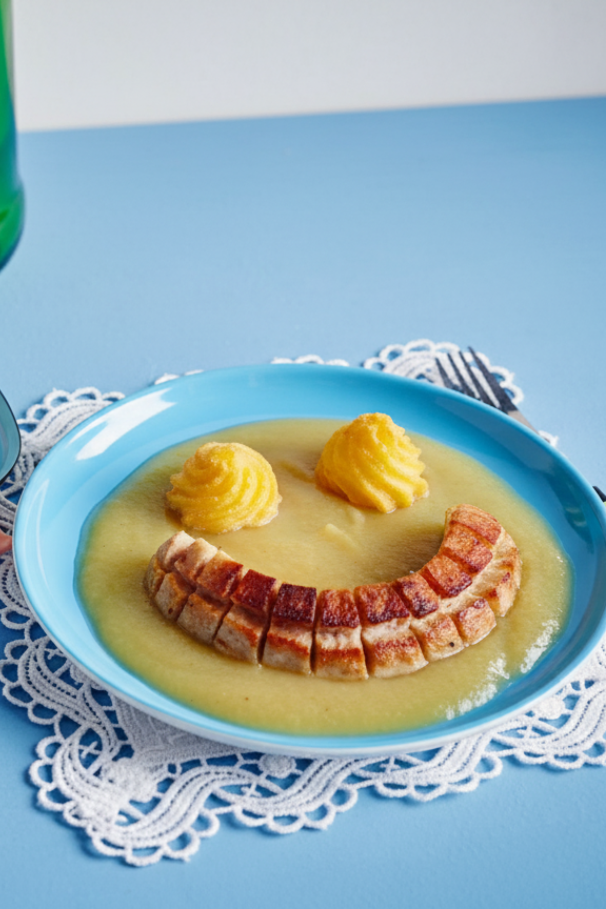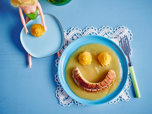 Maak op elk bord een cirkel van de appelmoes. Leg daarop twee krokante pommes duchesse naast elkaar en plaats de geprepareerde ‘tandjes‑pens’ bovenop. Zet de rest van de pensen, appelmoes en aardappelen op tafel zodat iedereen kan opscheppen.