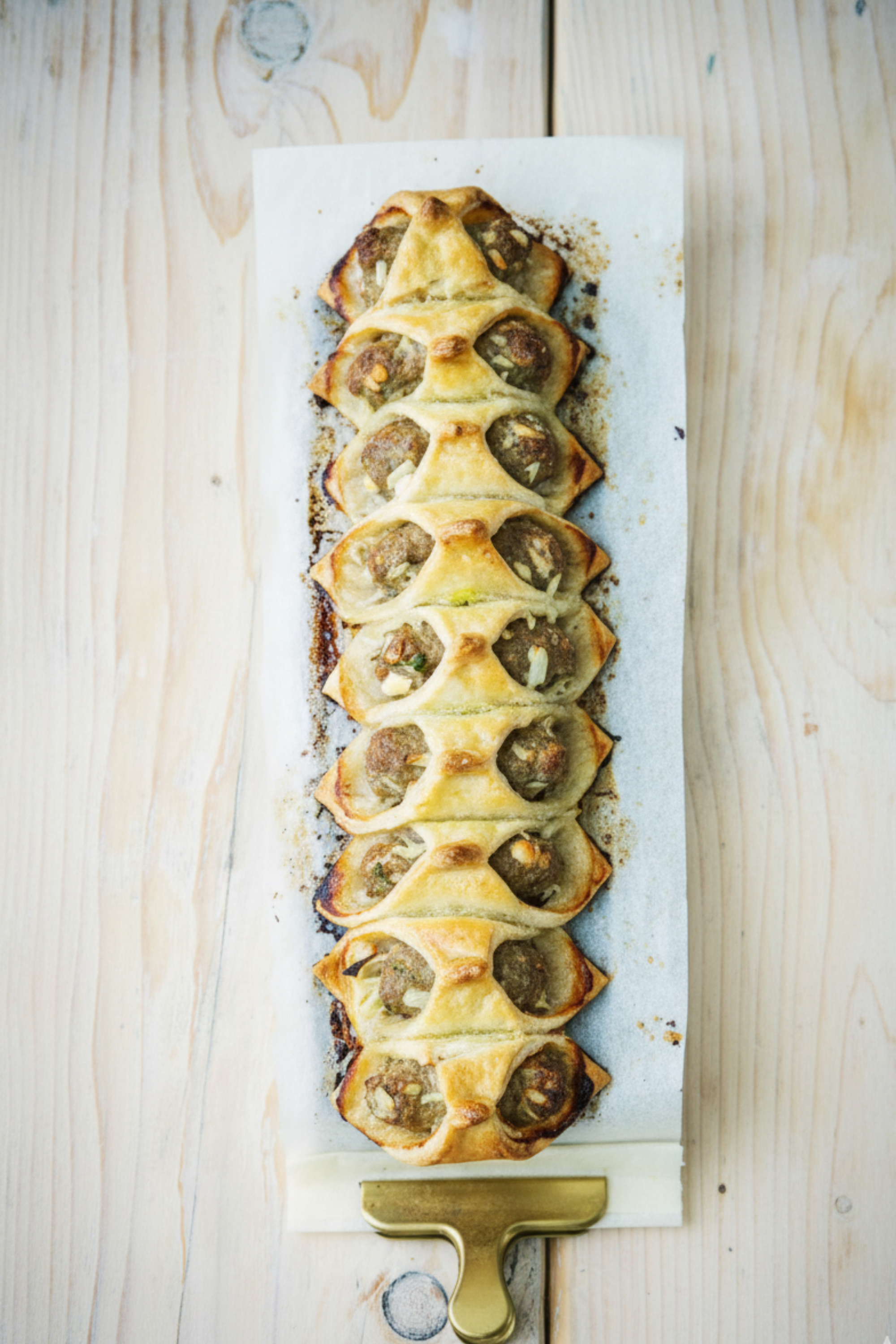 Snijd vierkantjes van 5 × 5 cm uit het deeg. Rol van het gehakt kleine worstjes van ongeveer 5 cm lang en leg deze schuin op de deegvierkantjes.