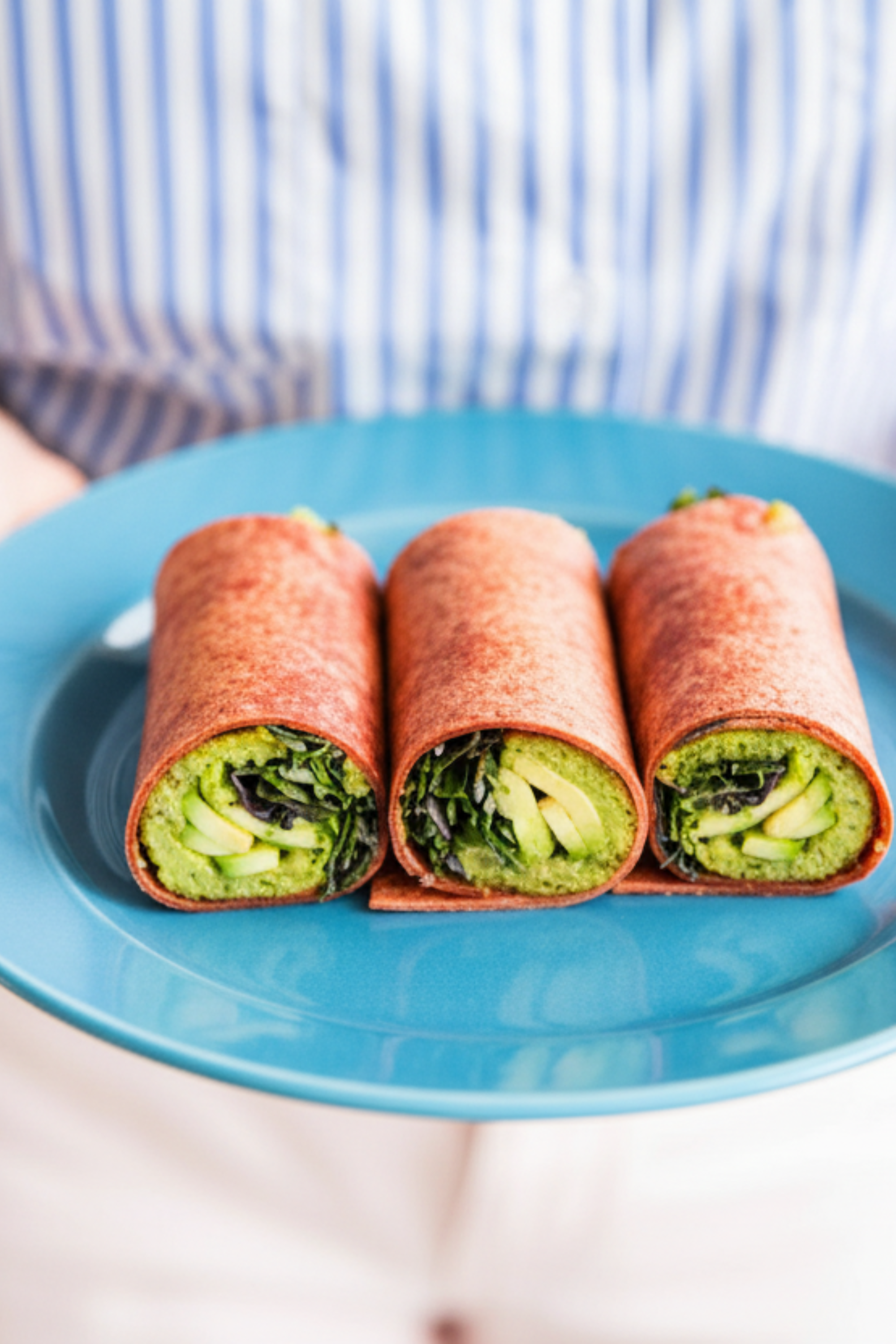 Serveer de wrap meteen als kleurrijke lunch of snack. Je kan hem ook in bakpapier wikkelen om mee te nemen als lunchboxfavoriet.