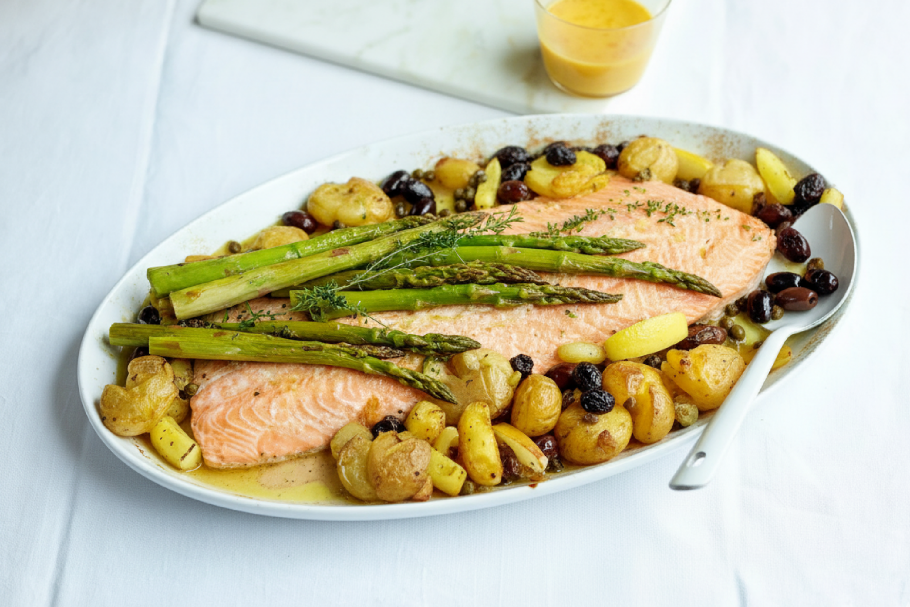 Plet de gekookte krieltjes lichtjes met een groot mes. Snijd de citroen in 8 partjes. Meng de krieltjes met de citroenpartjes, kalamata-olijven, kappertjes, 2 el olijfolie en wat peper. Leg dit mengsel rond de zalm in de ovenschaal. Schik de asperges bovenop de krieltjes en bestrooi met 4 takjes tijm.