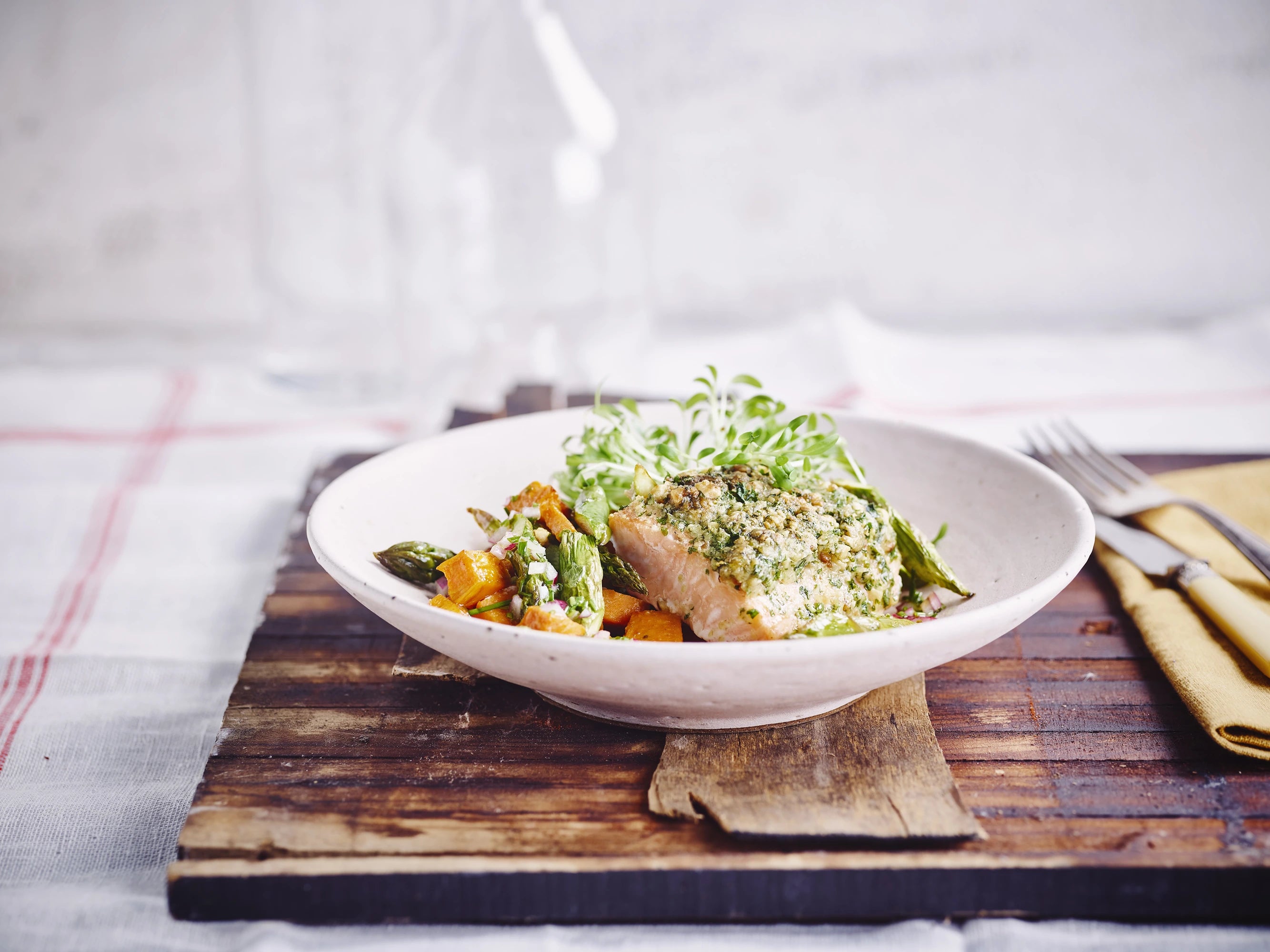 Zalm met parmezaan-kruidenkorst, asperges en zoete aardappel