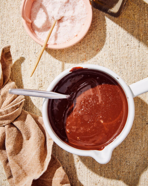 Zelfgemaakte chocoladesaus met fleur de sel en olijfolie