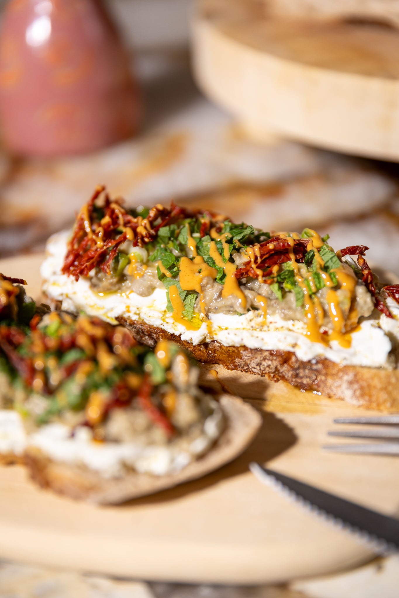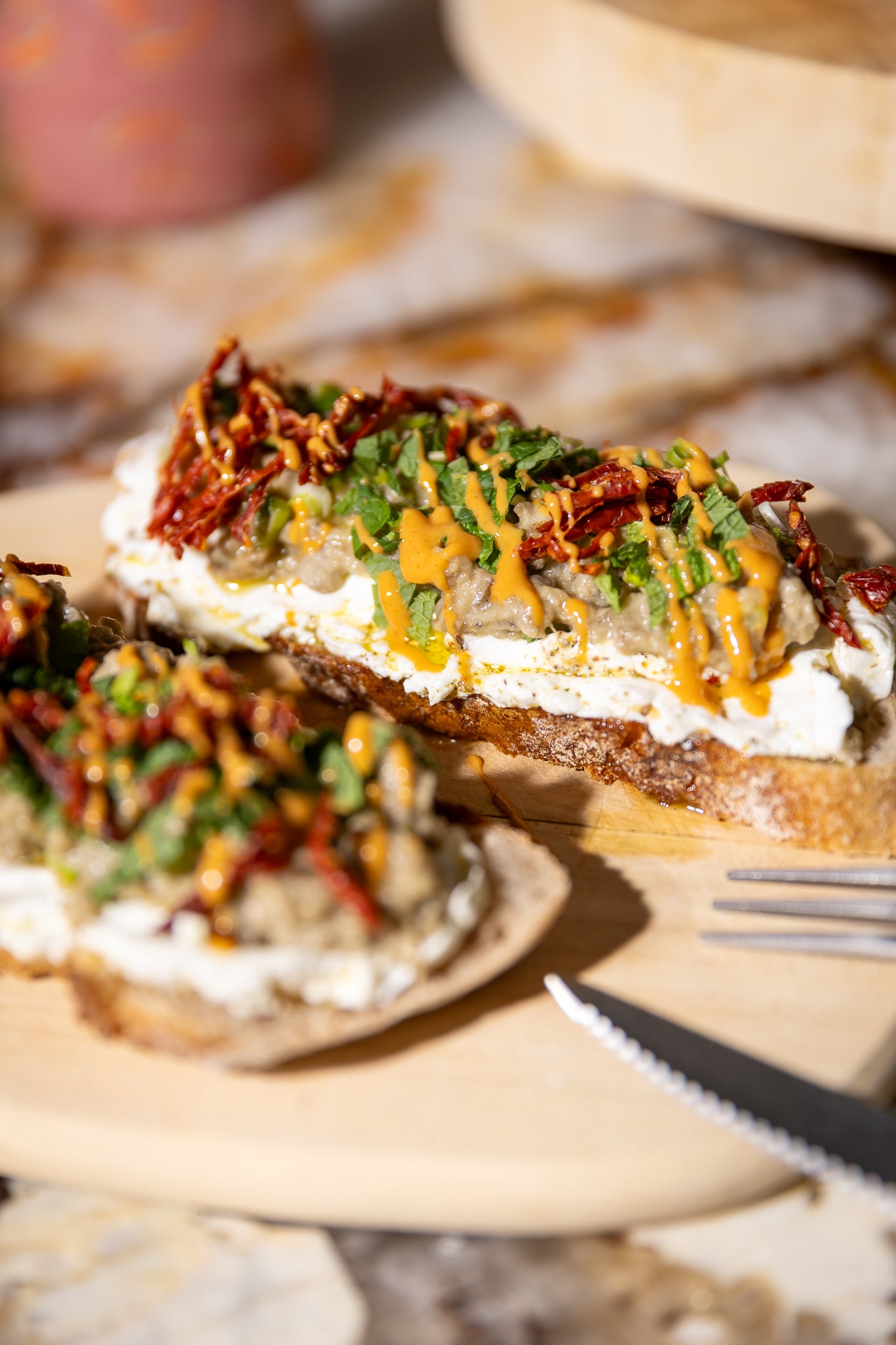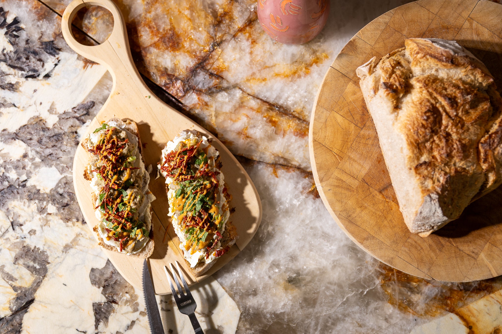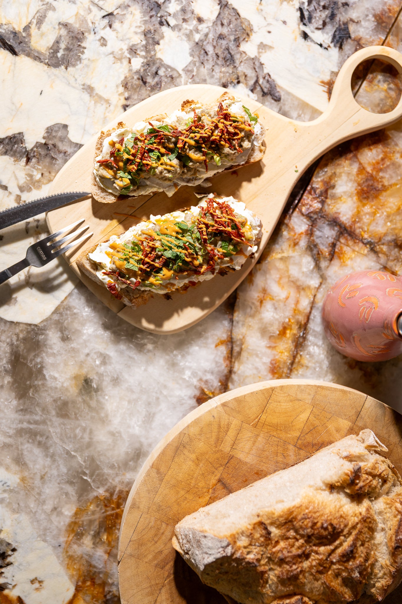 Zuurdesembrood met Labneh, Babaganoush, Zongedroogde Tomaten en Chili-Pindaboter