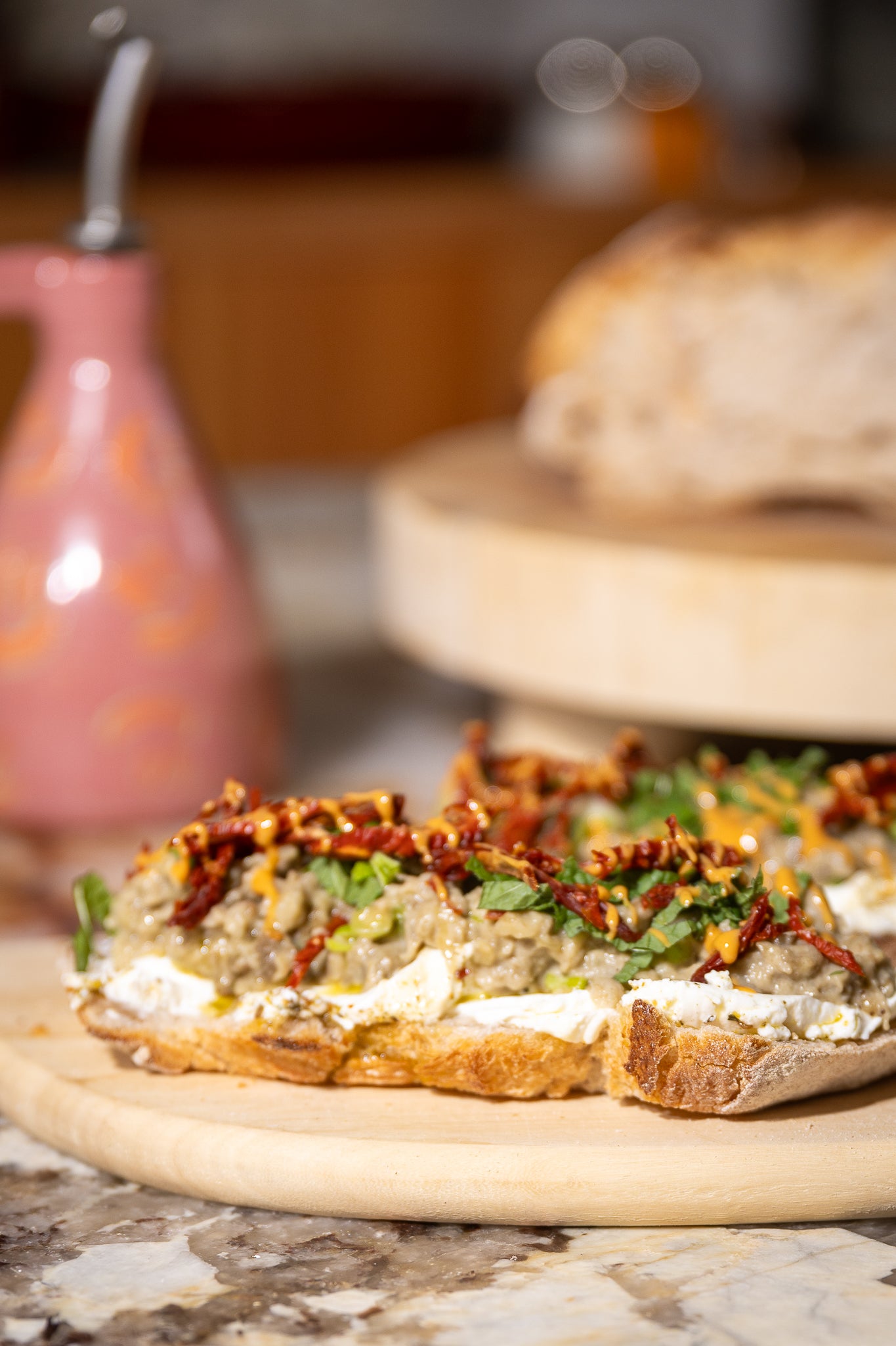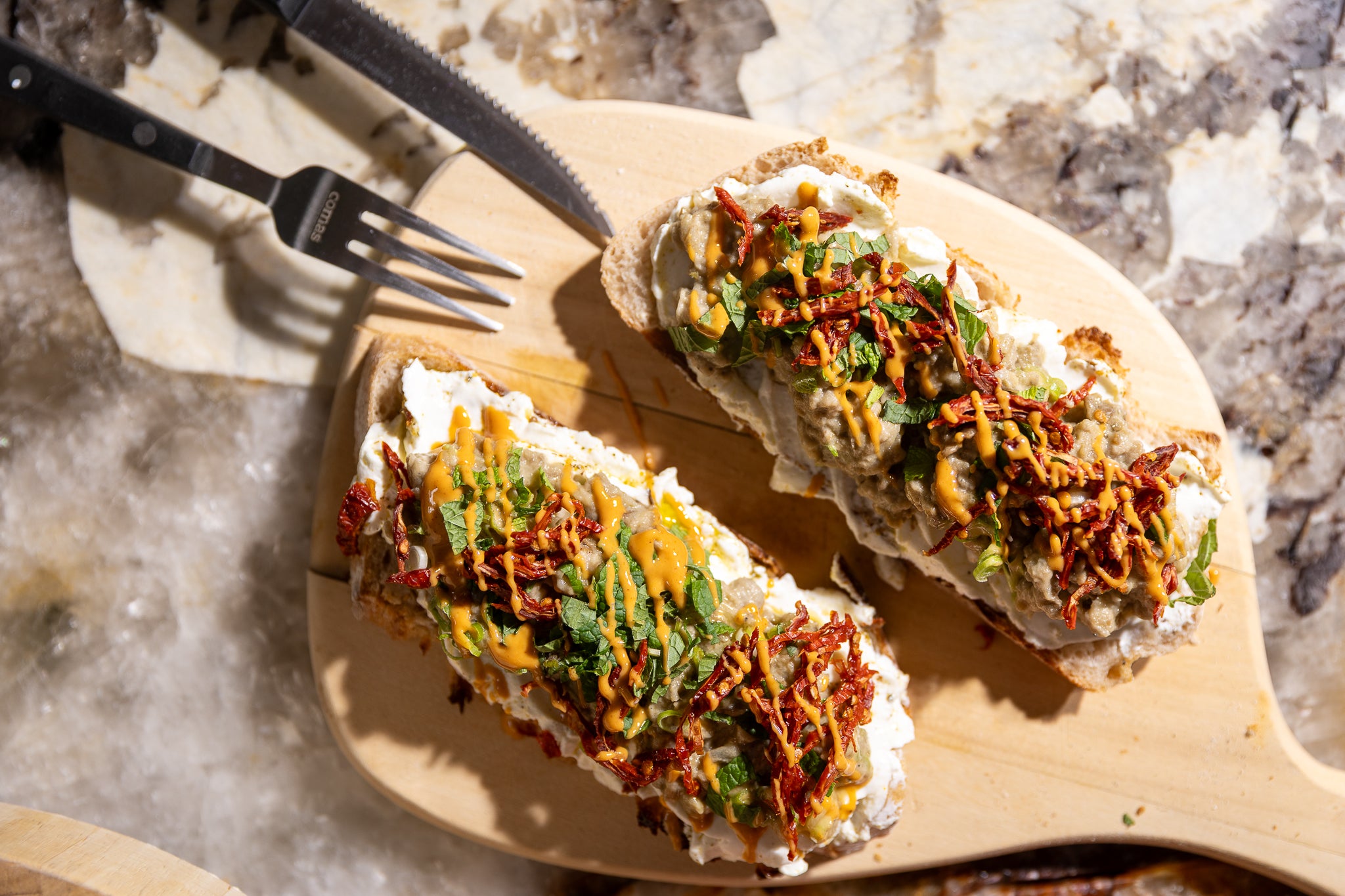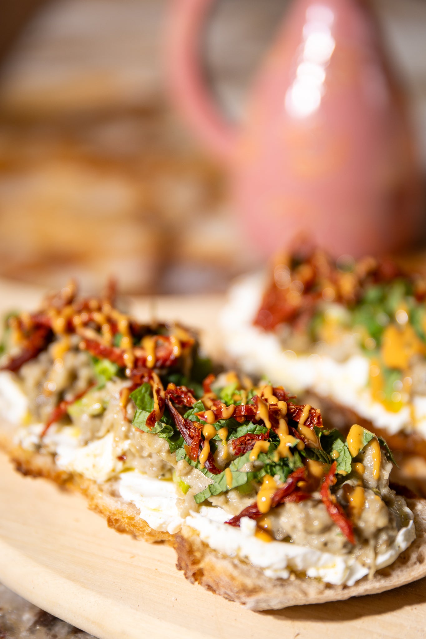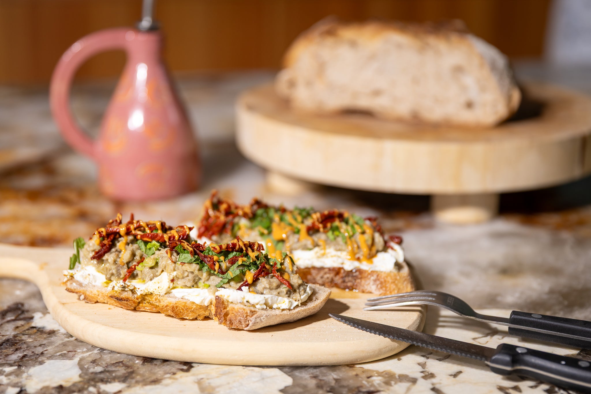 Zuurdesembrood met Labneh, Babaganoush, Zongedroogde Tomaten en Chili-Pindaboter