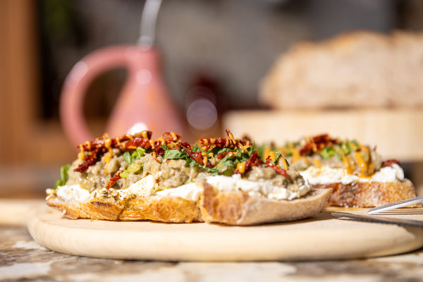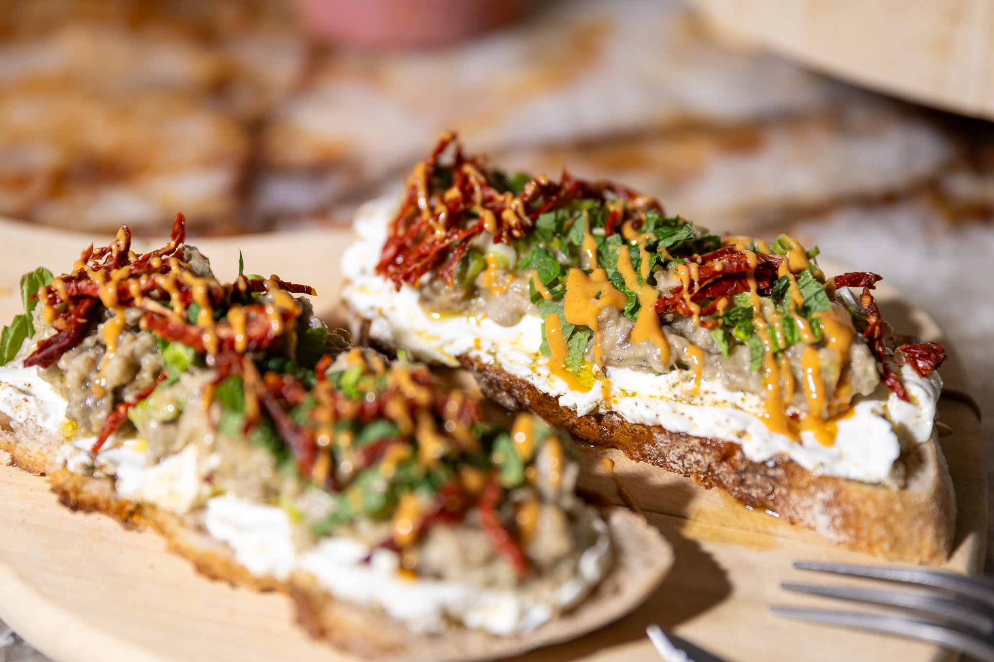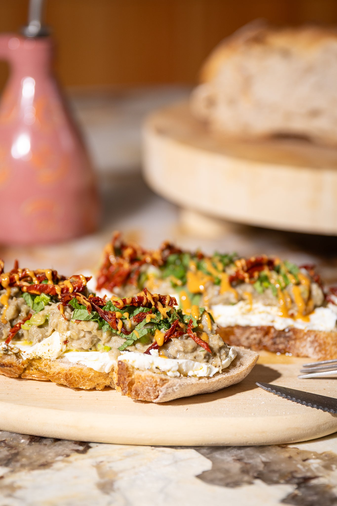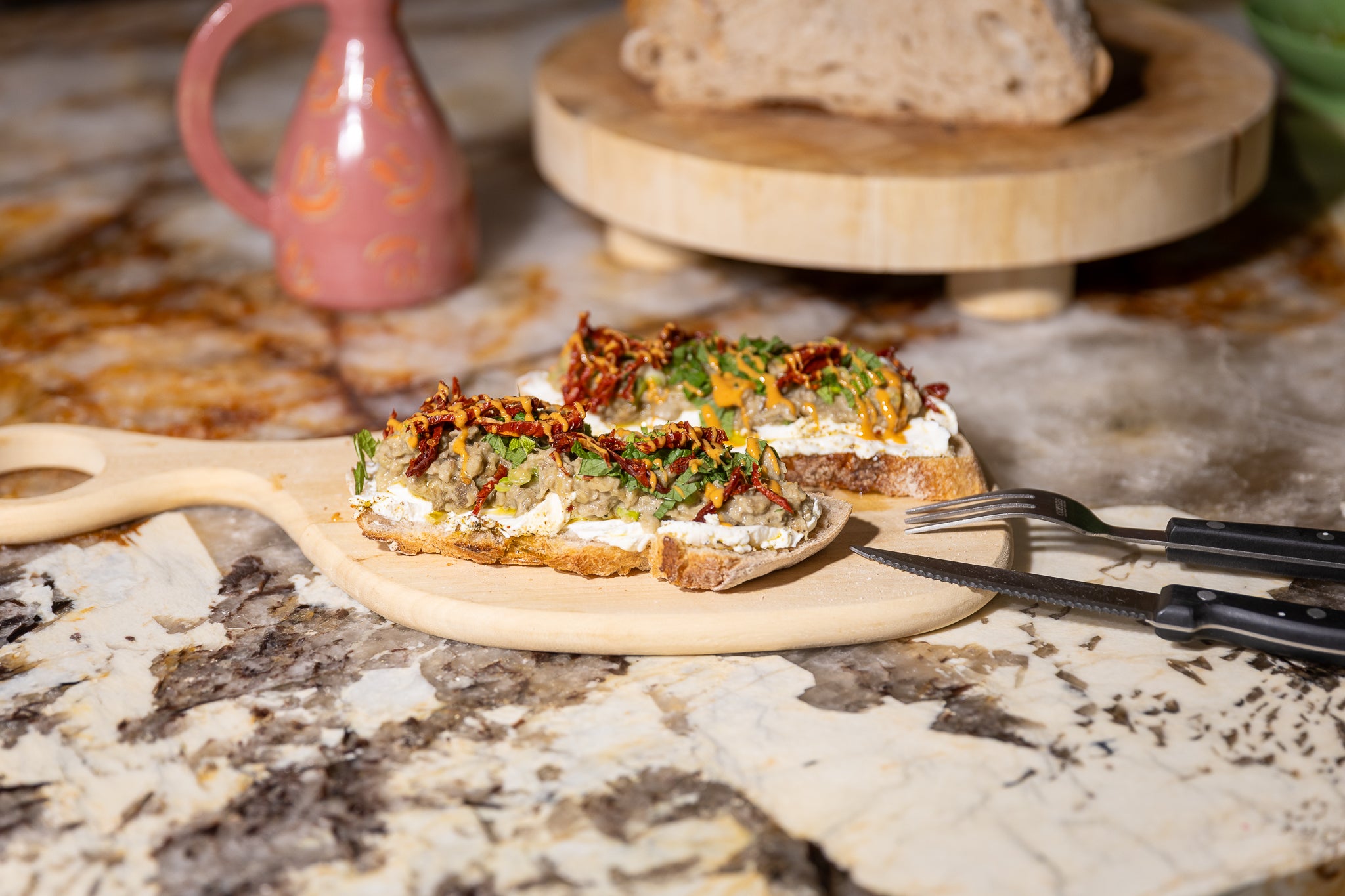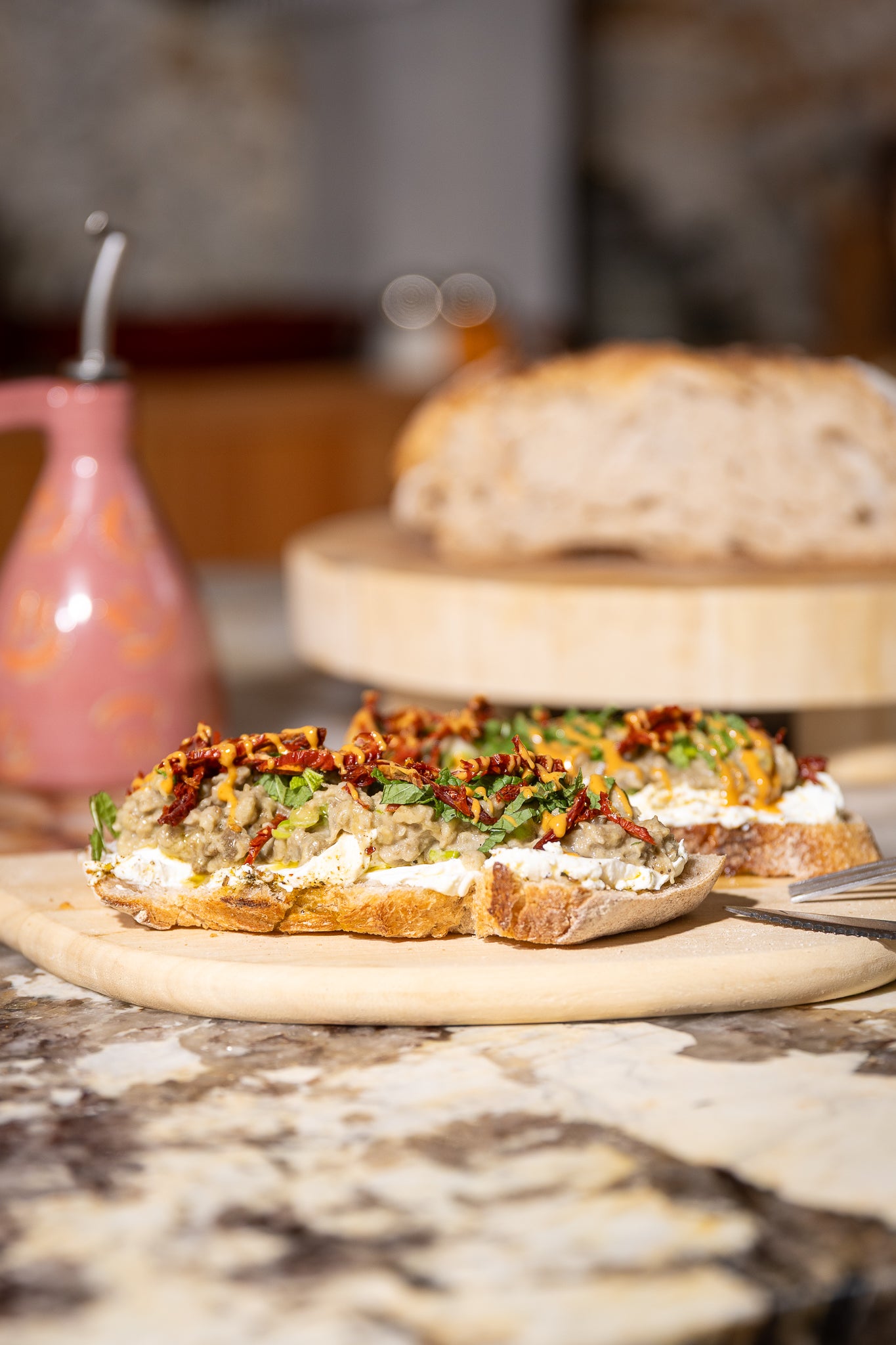 Zuurdesembrood met Labneh, Babaganoush, Zongedroogde Tomaten en Chili-Pindaboter
